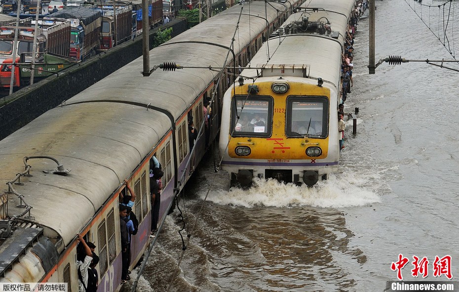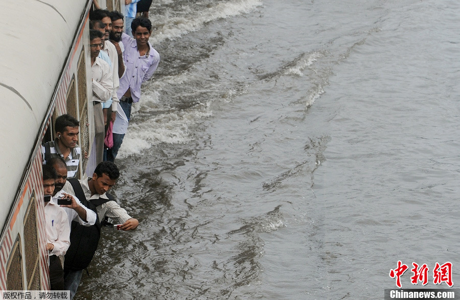 8月29日,印度孟买连续三天遭遇大暴雨,火车在被水淹没的铁路上前行,乘客纷纷探出头来观车外水景。