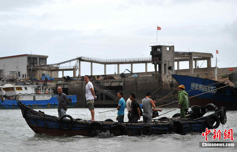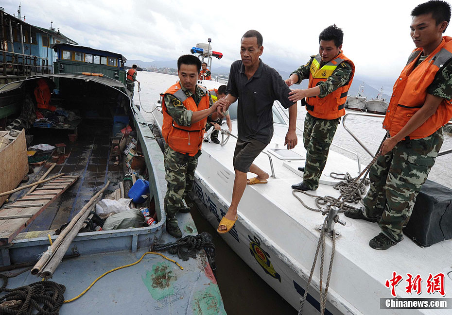 8月29日,驻守在福建福州马尾、宁德沙埕、福清一线的福建省海警一支队官兵紧急启动防抗台风三级预案,迎战今年第11号强热带风暴“南玛都”。图为当日下午福建省海警一支队官兵驾驶高速边防巡逻艇深入福建长乐营前渔船临时停泊点,引导渔船安全进入锚地。福建省气象台29日14时47分继续发布台风橙色预警信号。今年第11号强热带风暴“南玛都”,当日14时中心距晋江沿海约190公里的海峡海面上。 预计“南玛都”将以每小时10-15公里的速度向西北方向移动,逐渐向福建省中南部沿海靠近,可能于30日白天在福建莆田~漳浦一带沿海登陆。中新社发 刘可耕 摄