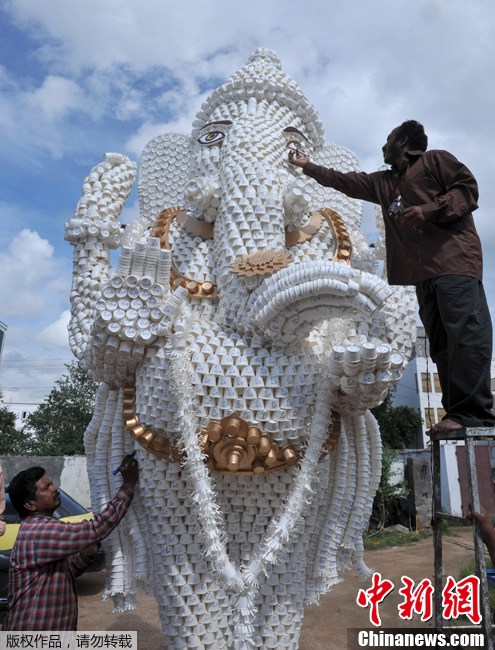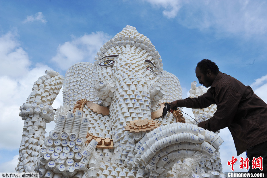 印度3万个纸杯制成环保神像