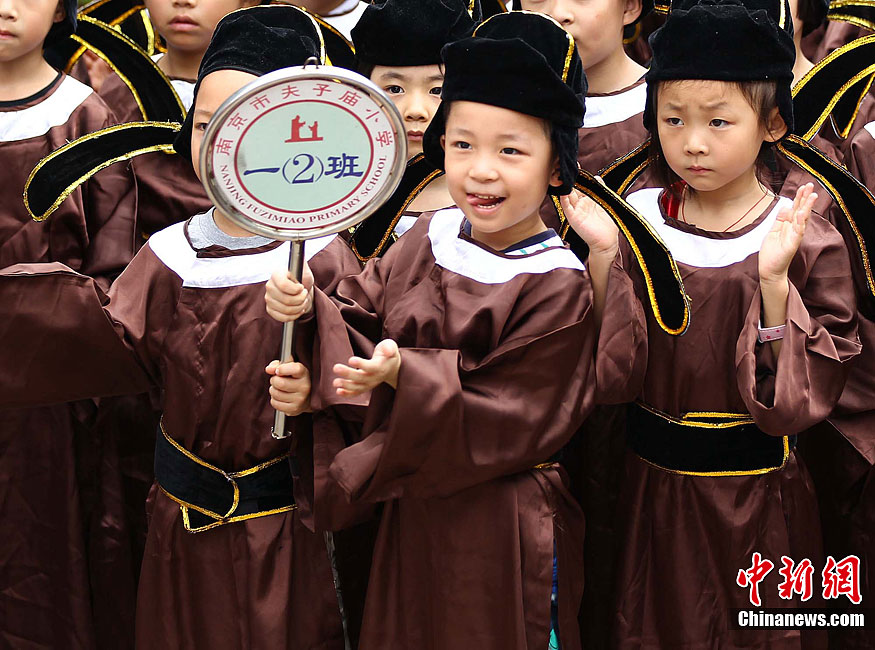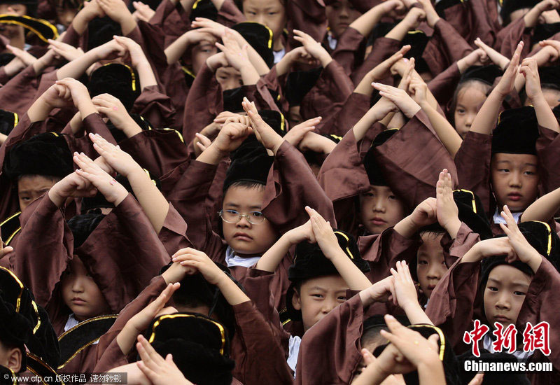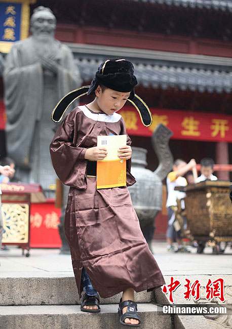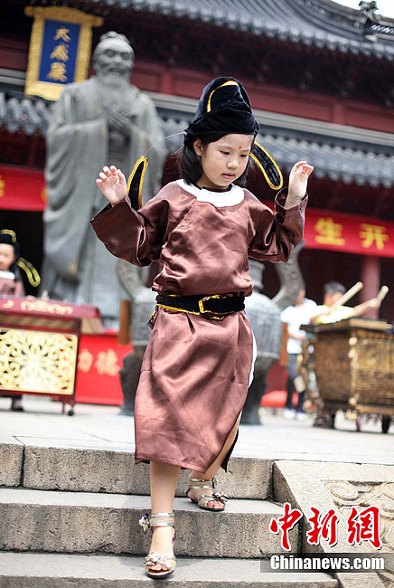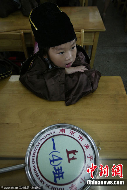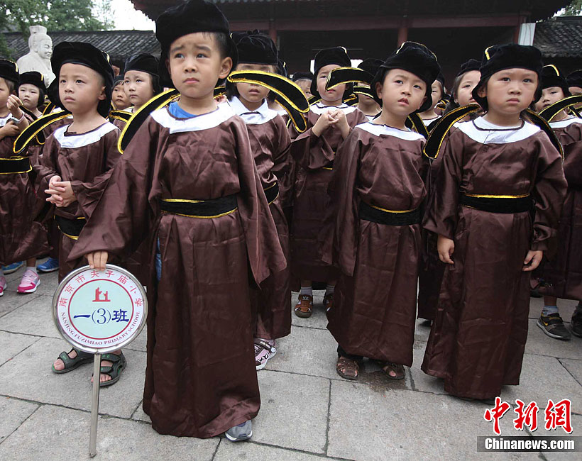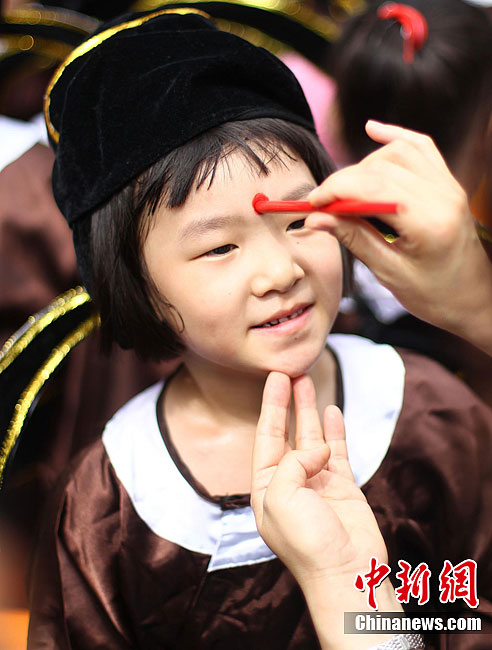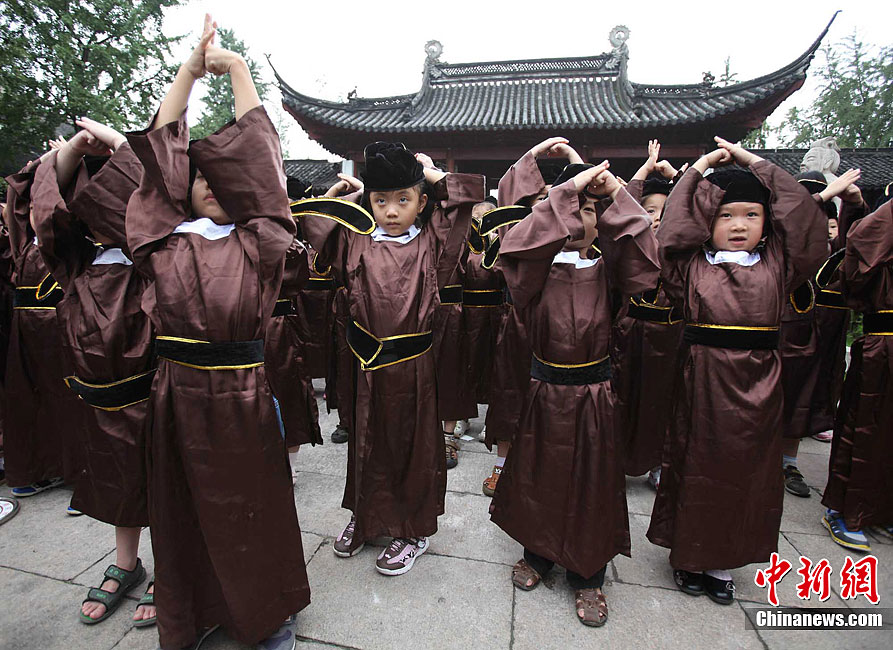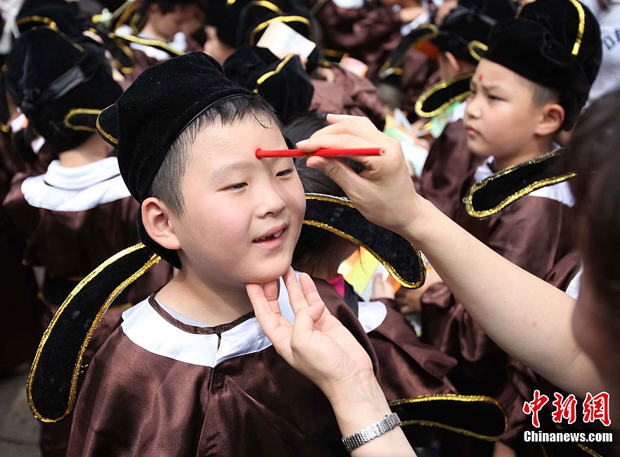8月31日,老师按传统习俗在孩子们额头正中点上朱砂,祝他们从此眼明心明好读书。当日,在南京夫子庙的明德堂前,夫子庙小学的两百多名一年级新生举行“开笔礼”仪式,孩子们身穿古代儒生礼服,头戴长翅璞头帽,在老师的带领下祭拜孔子、诵读《论语》、学写“人”字、敲启蒙钟,接受“尚礼”传统文化教育和师长祝愿,由此正式成为一名学生。中新社发 泱波 摄