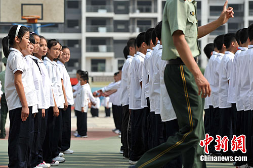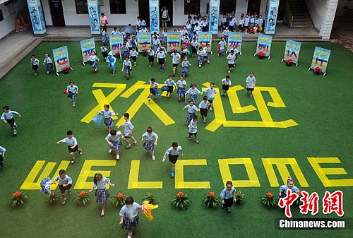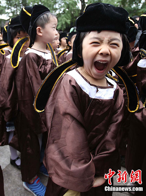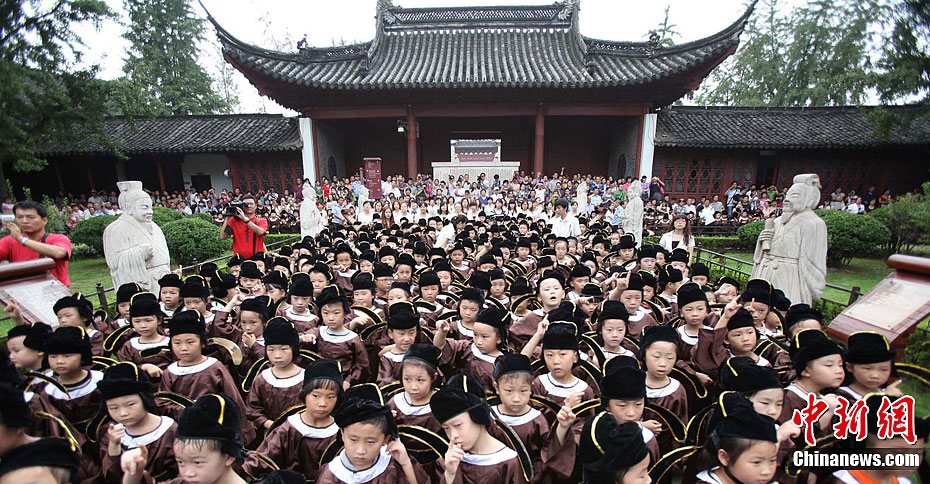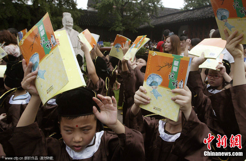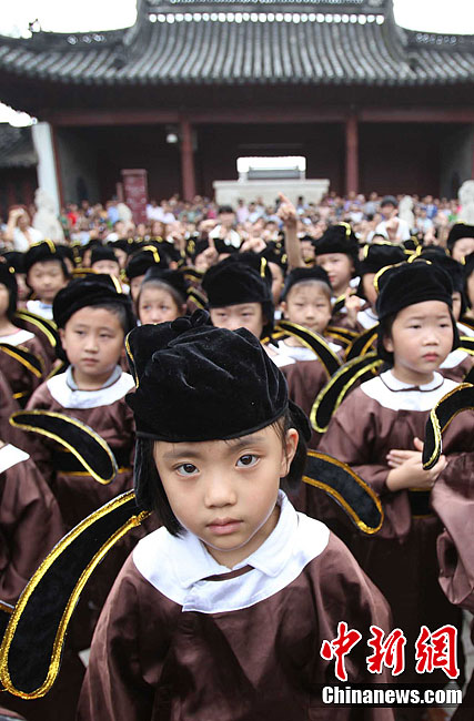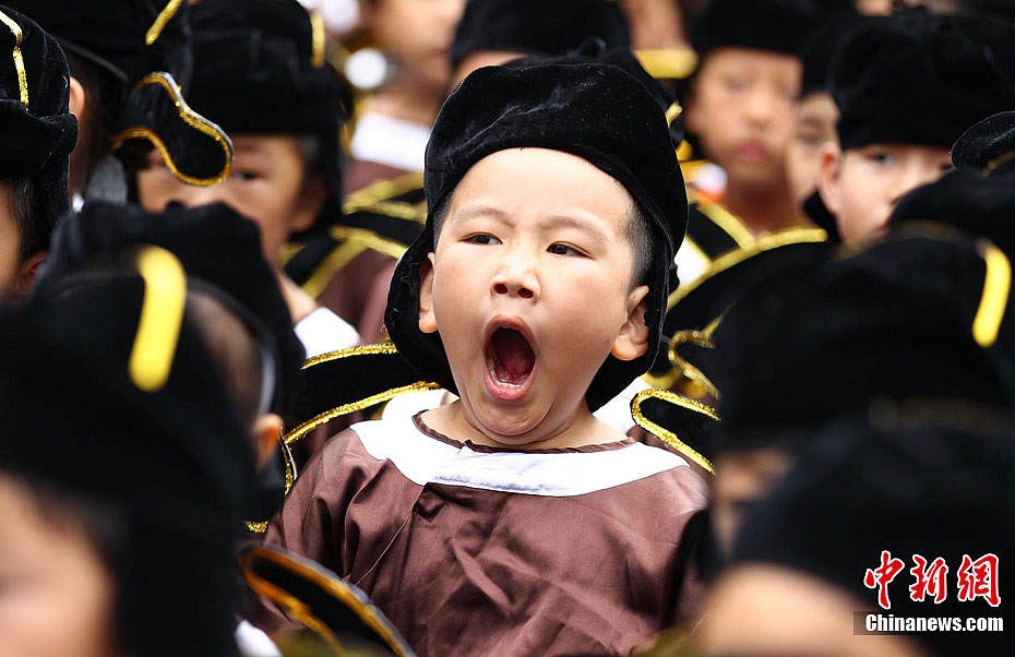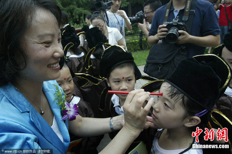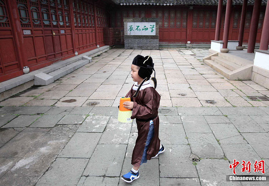 8月31日,老师按传统习俗在孩子们额头正中点上朱砂,祝他们从此眼明心明好读书。当日,在南京夫子庙的明德堂前,夫子庙小学的两百多名一年级新生举行“开笔礼”仪式,孩子们身穿古代儒生礼服,头戴长翅璞头帽,在老师的带领下祭拜孔子、诵读《论语》、学写“人”字、敲启蒙钟,接受“尚礼”传统文化教育和师长祝愿,由此正式成为一名学生。中新社发 泱波 摄