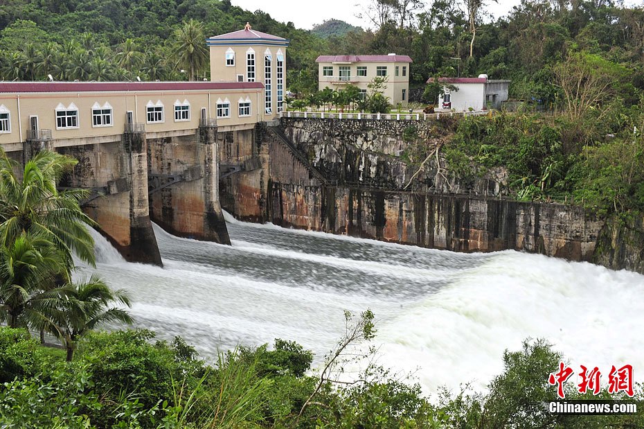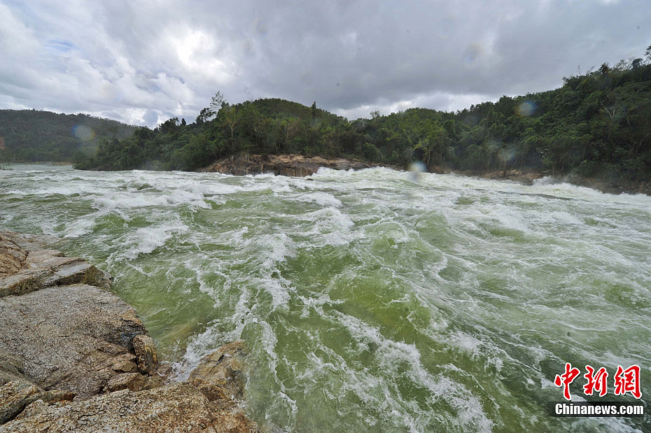 10月7日,海南最大水库——松涛水库正在泄洪。该水库目前蓄水量约27亿立方米,自3日开始泄洪,此次泄洪量预计约1500万立方米,水位将下降1米左右,这是自1990年来泄洪量最大的一次。连日来,海南连遭台风袭击,所带来的持续降雨使海南所有水库都蓄满了水,其中松涛水库和大广坝由于蓄水量过多不得不开闸泄洪。中新社发 骆云飞 摄