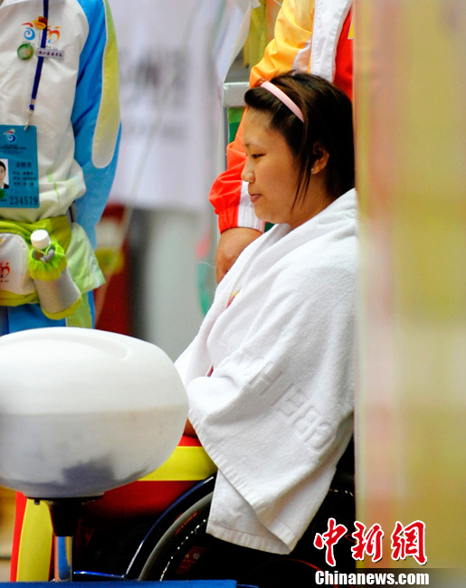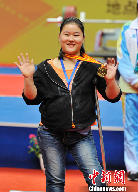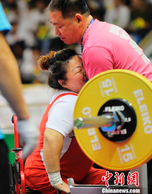10月14日上午,第八届全国残疾人运动会举重比赛在杭州体育馆决出两枚金牌,内蒙古的杨艳和浙江队员谭玉娇分获女子60公斤级和女子67.5公斤级的冠军。图为杨艳出场时振臂高昂为自己打气。中新网记者 李美多 摄