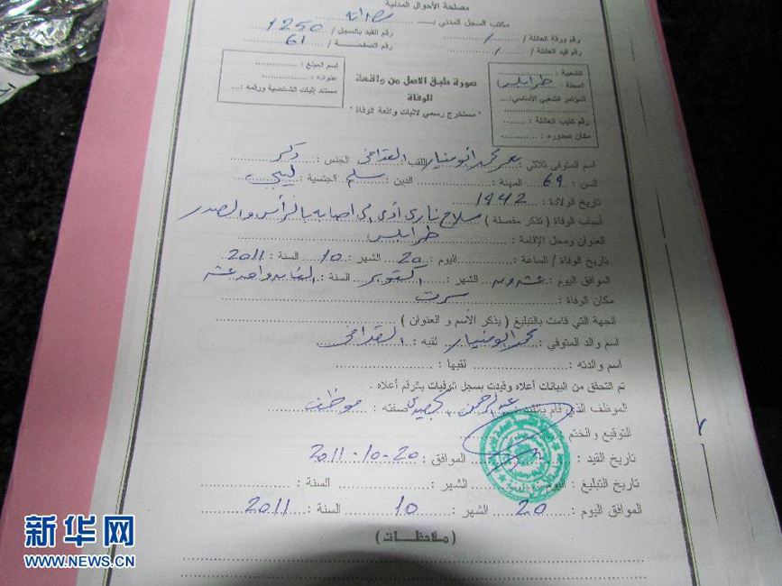 这是10月23日在利比亚班加西拍摄的卡扎菲之子穆塔西姆的死亡报告。拉米亚·瑞兹古依 摄 图片来源:新华网