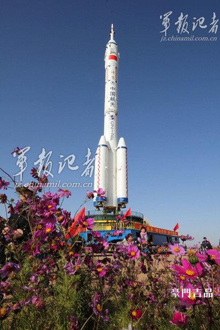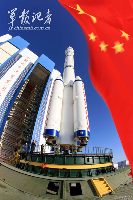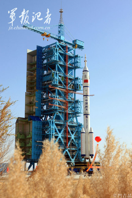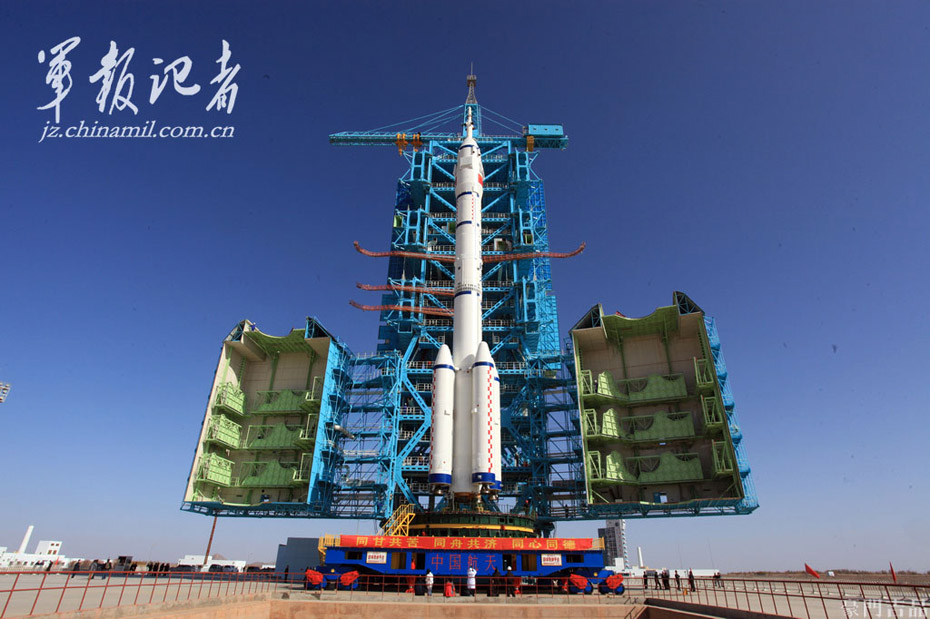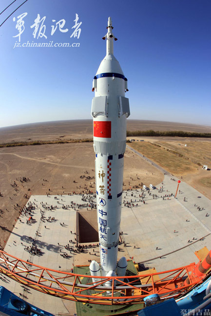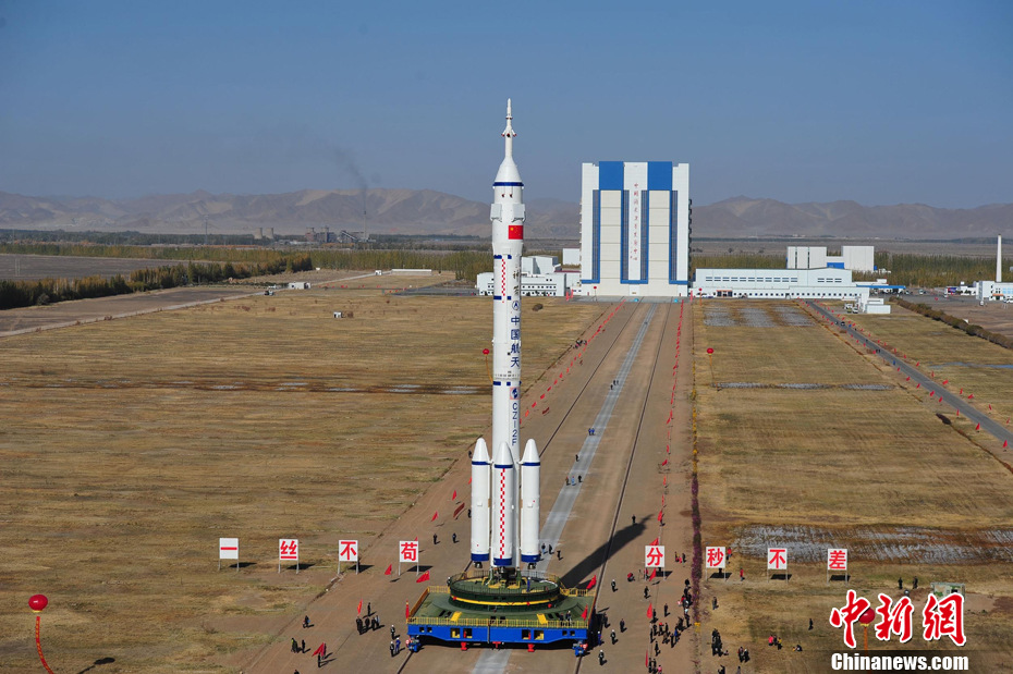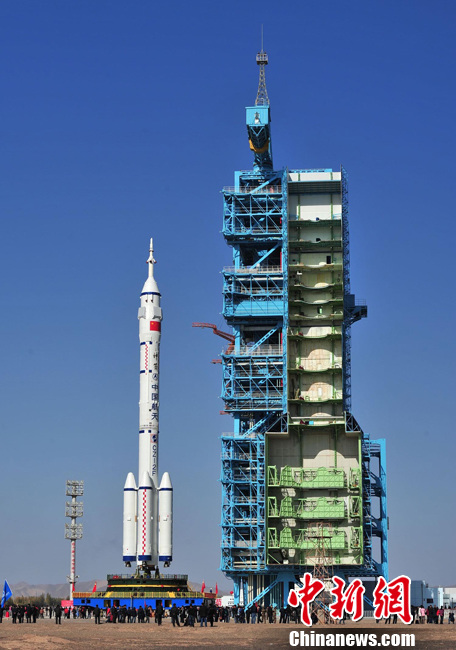 执行中国首次空间交会对接任务的神舟八号飞船、长征二号F遥八火箭,10月26日在酒泉卫星发射中心载人航天发射场顺利转运至发射区,这标志着神舟八号飞船发射已进入倒计时。根据计划,神舟八号飞船将于11月初在酒泉卫星发射中心择机发射。中新社发 宿东 摄
