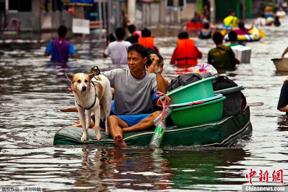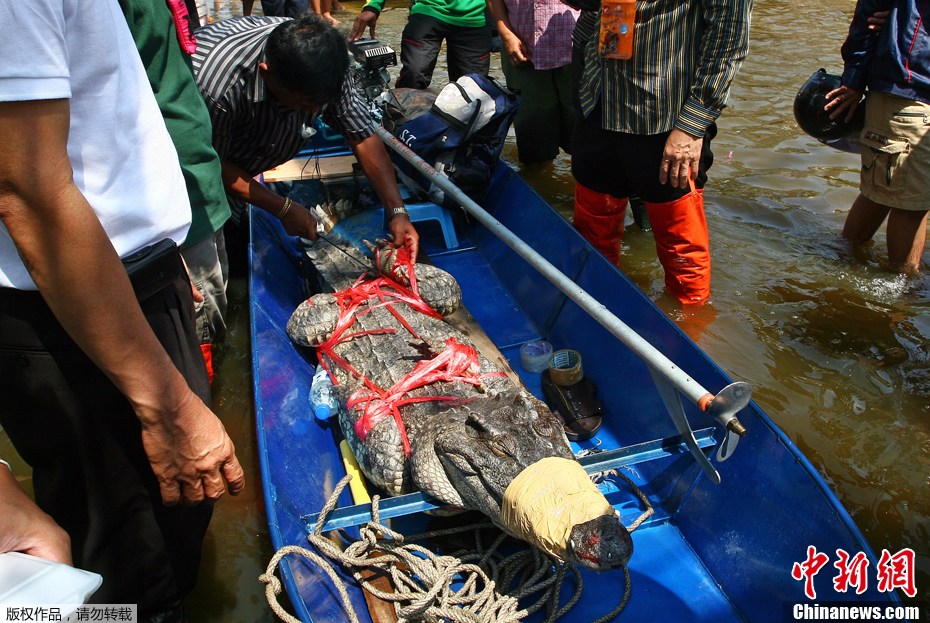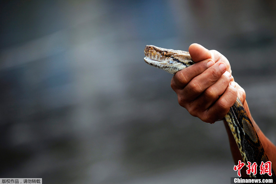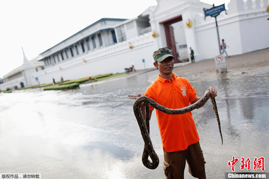 泰国洪峰涌入曼谷 居民洪水中捕获蟒蛇