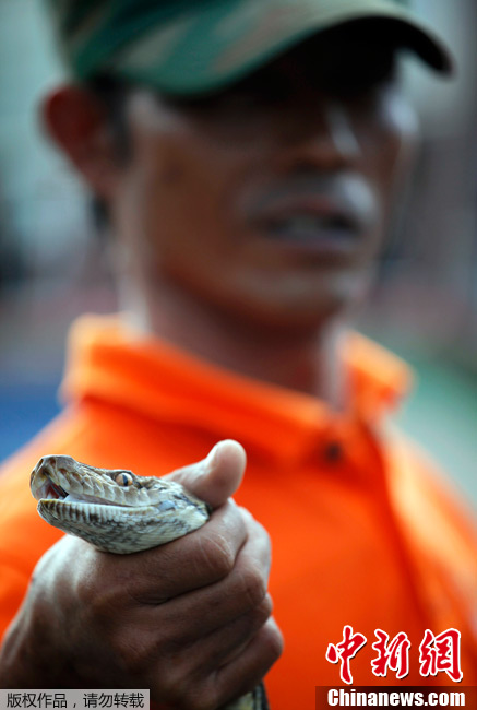 10月28日,泰国首都曼谷,一名出租车司机在大皇宫外的洪水里捕获了一条蟒蛇。泰国救灾当局27日称,洪水继续在全国26个省肆虐,死亡人数为373人,还有两名失踪者。泰国总理英拉27日要求曼谷市民尽量离开曼谷市,以避免人员发生危险,减轻救灾人员负担。