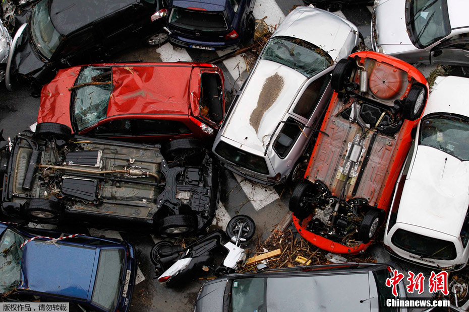 当地时间2011年11月5日,意大利热那亚,暴雨过后,街道上遭毁坏的汽车堆积如山。意大利北部城市热那亚4日起遭暴雨袭击,在部分城区引发洪水,已导致多人死亡。