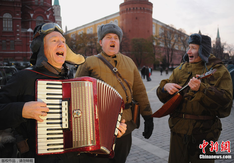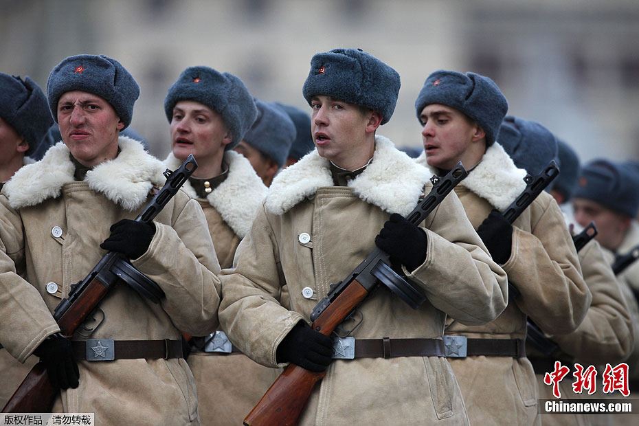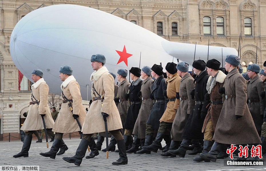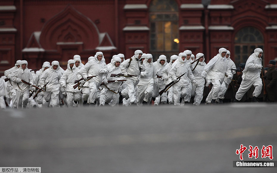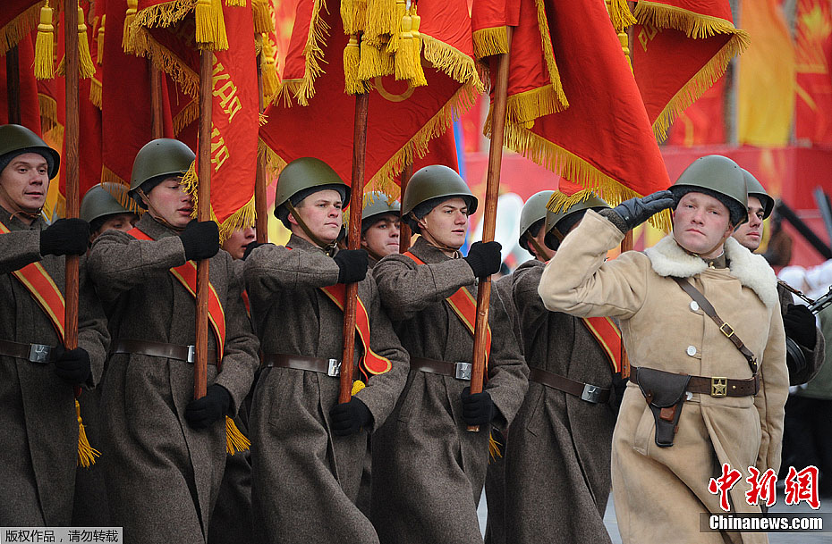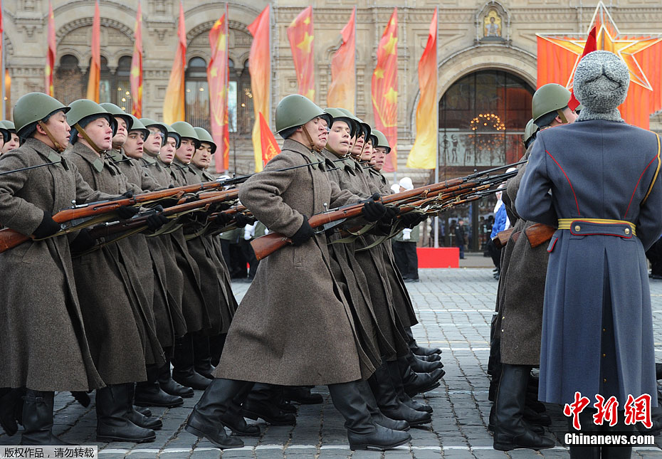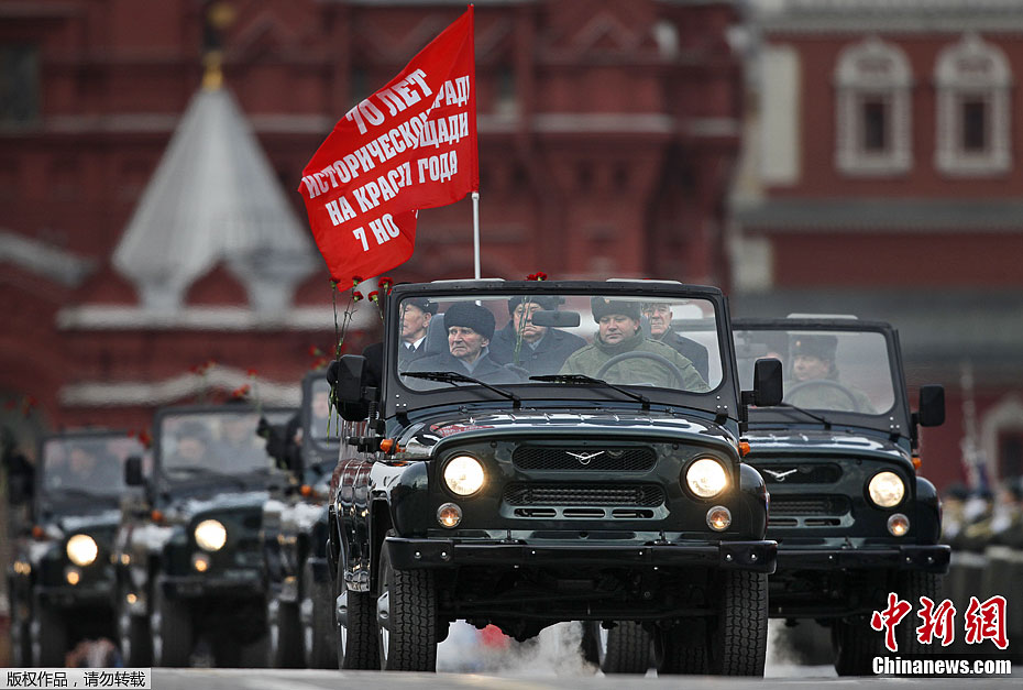 当地时间11月7日,俄罗斯莫斯科红场举行盛大游行,纪念红场阅兵70周年。1941年11月7日,在德国法西斯军队兵临莫斯科城下之际,苏联军队在红场上举行了阅兵式,纪念十月革命24周年。参加阅兵式的部队在阅兵完毕后直接开赴前线同入侵的法西斯德军作战。