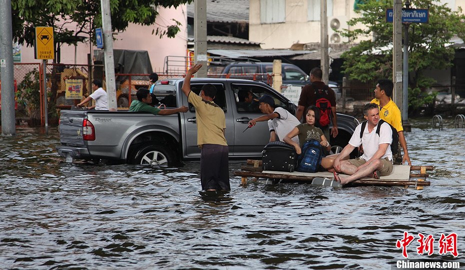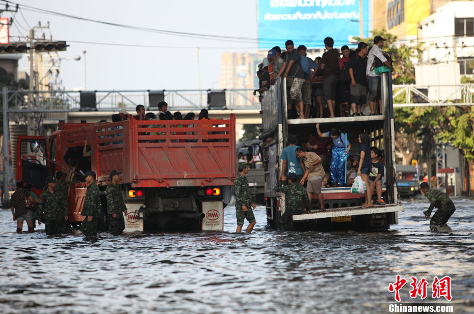 11月7日,洪水继续向曼谷中心城区推进,有更多的市民需要疏散,曼谷市出动多种类型交通工具为市民代步,这是军方的高底盘吉普车在帮助疏散市民。中新社发 余显伦 摄