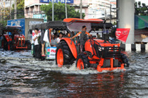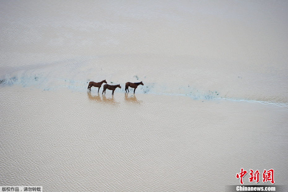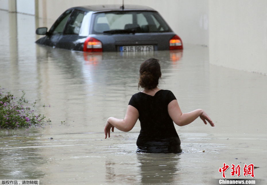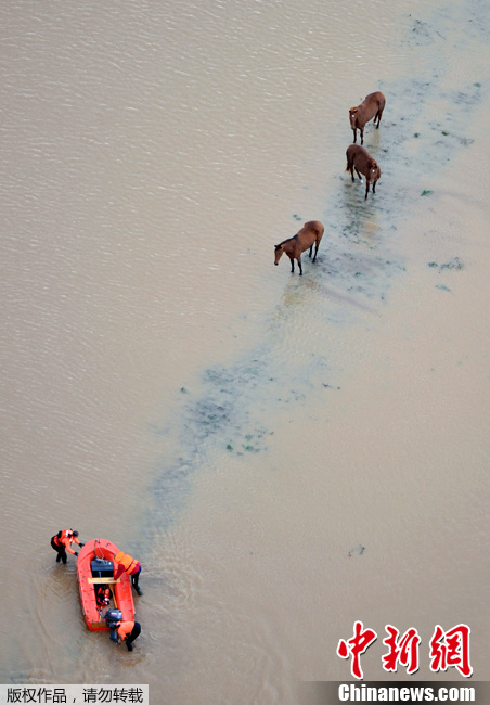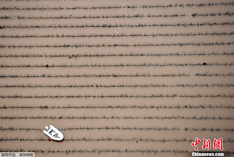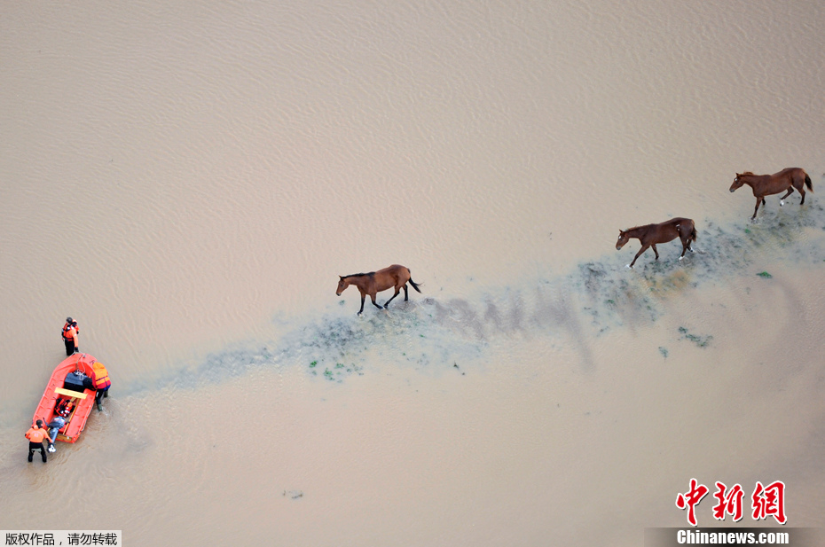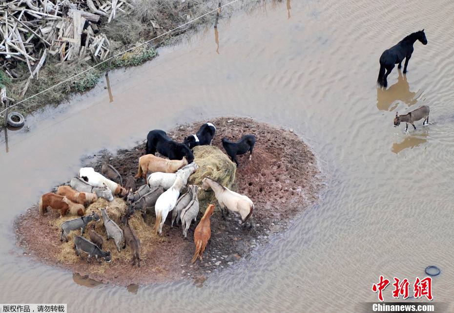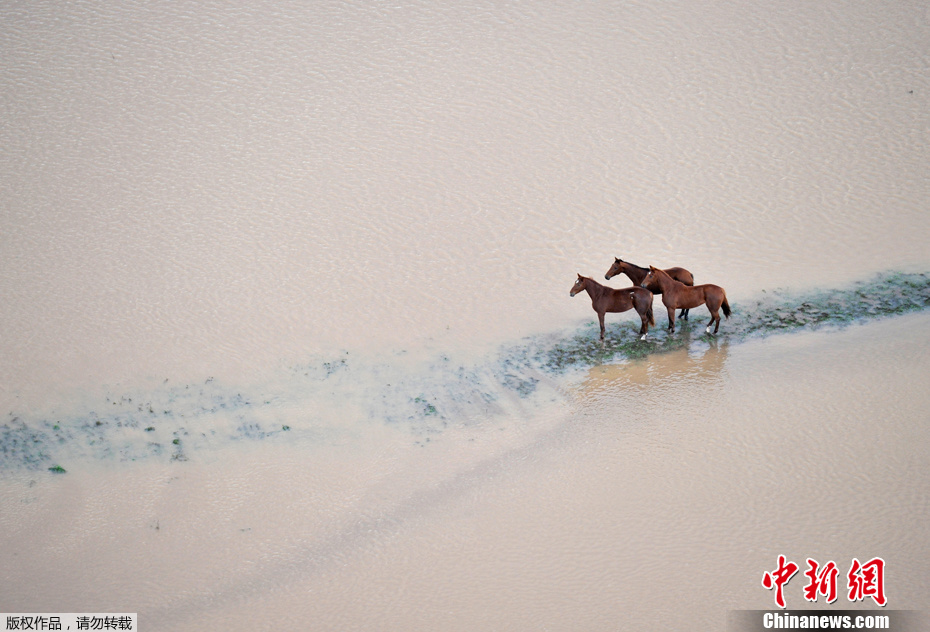 当地时间2011年11月7日,法国东南部小镇Roquebrune-sur-Argens洪水泛滥,大量家畜动物被困洪水孤岛等待救援。