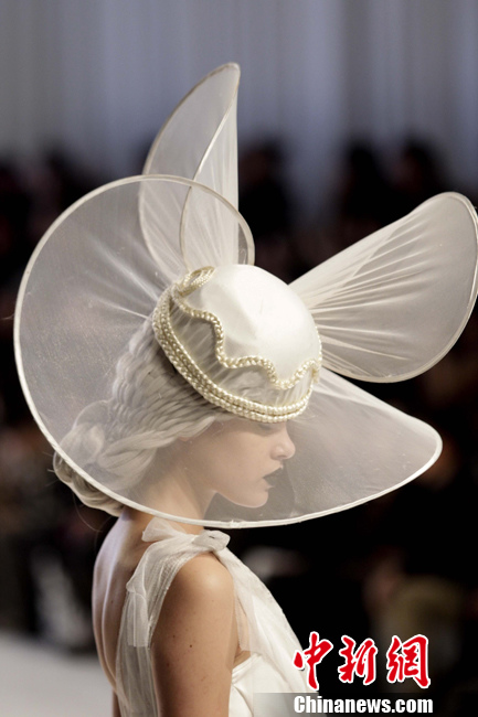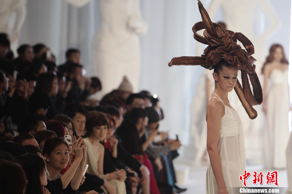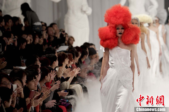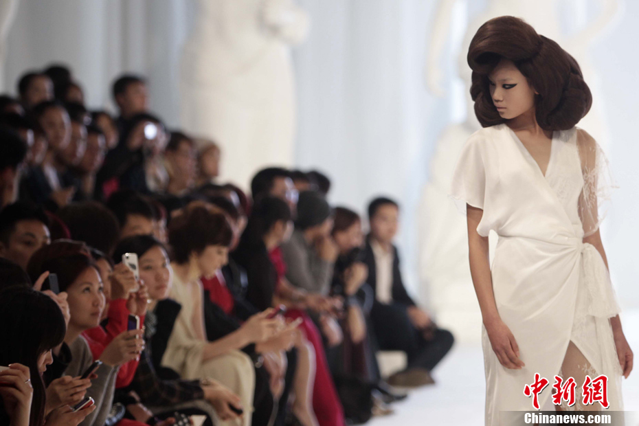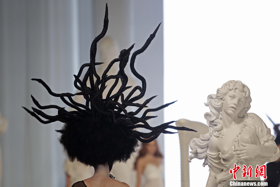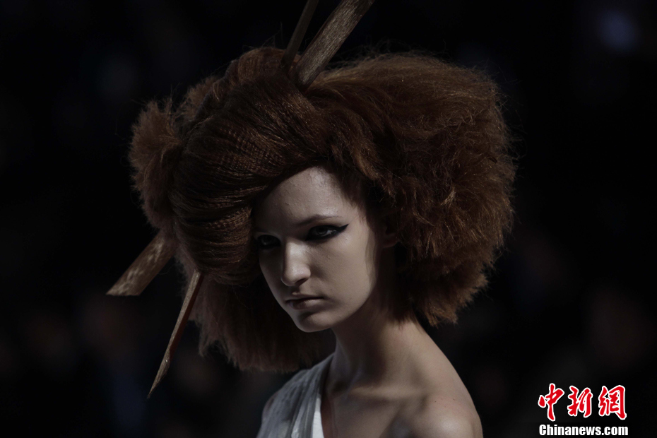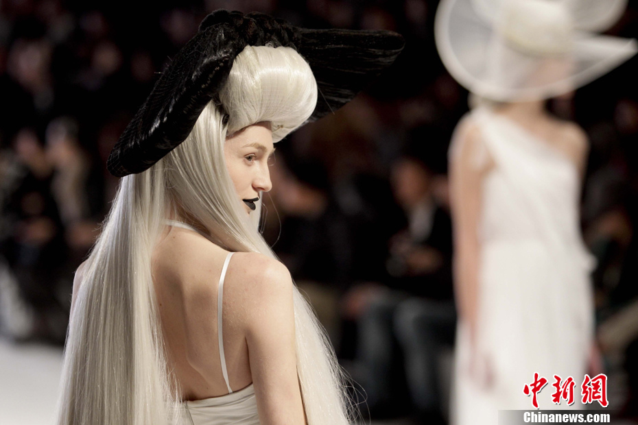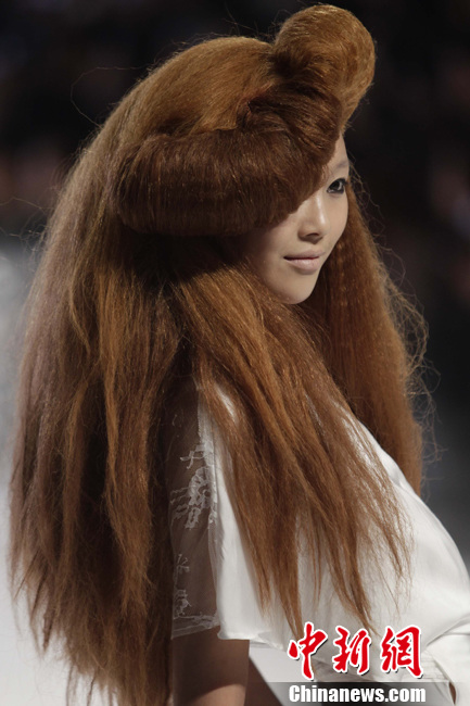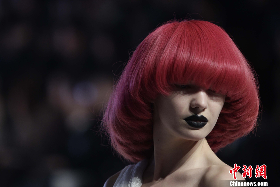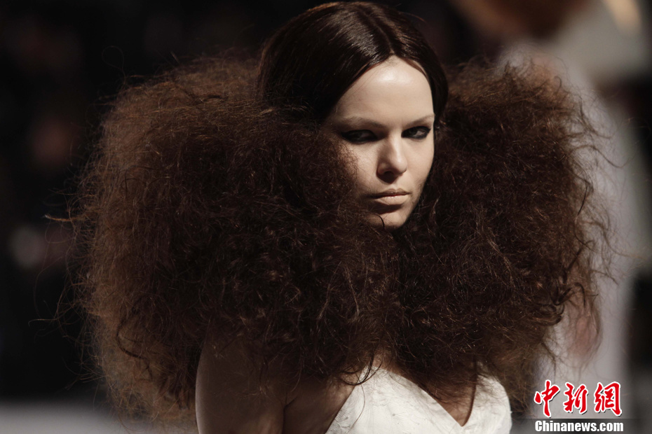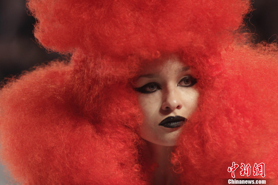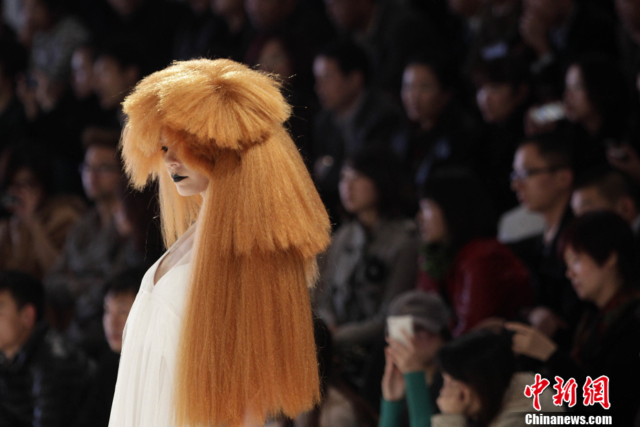 11月7日晚,模特在舞台上展示一款假发。当日,顶级假发品牌Rebecca在北京发布2012发型流行趋势和最新设计,“流·型”与“舞·彩”两大系列惊艳亮相。中新社发 盛佳鹏 摄