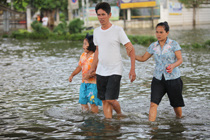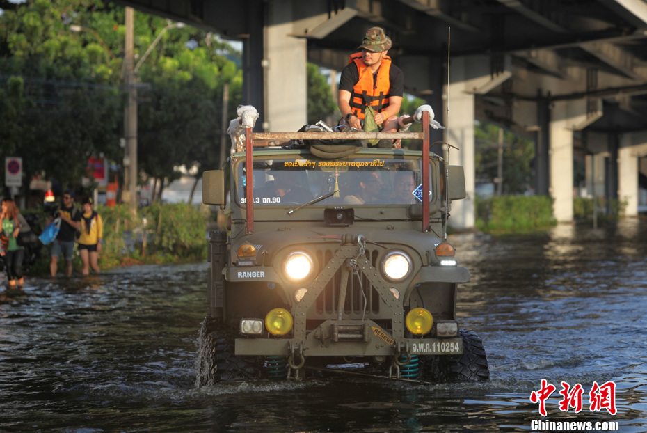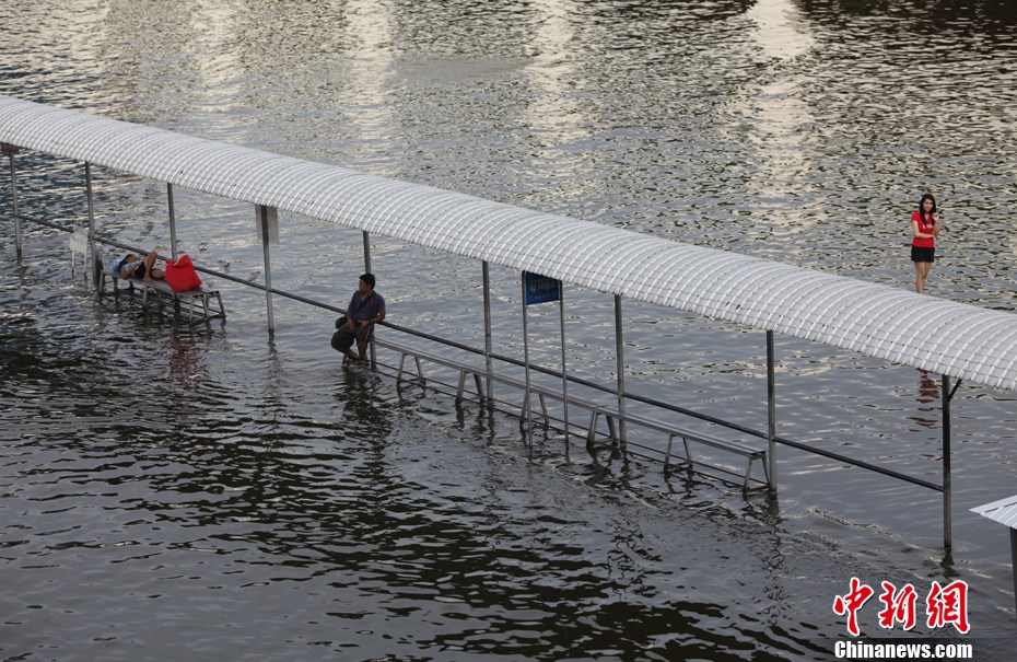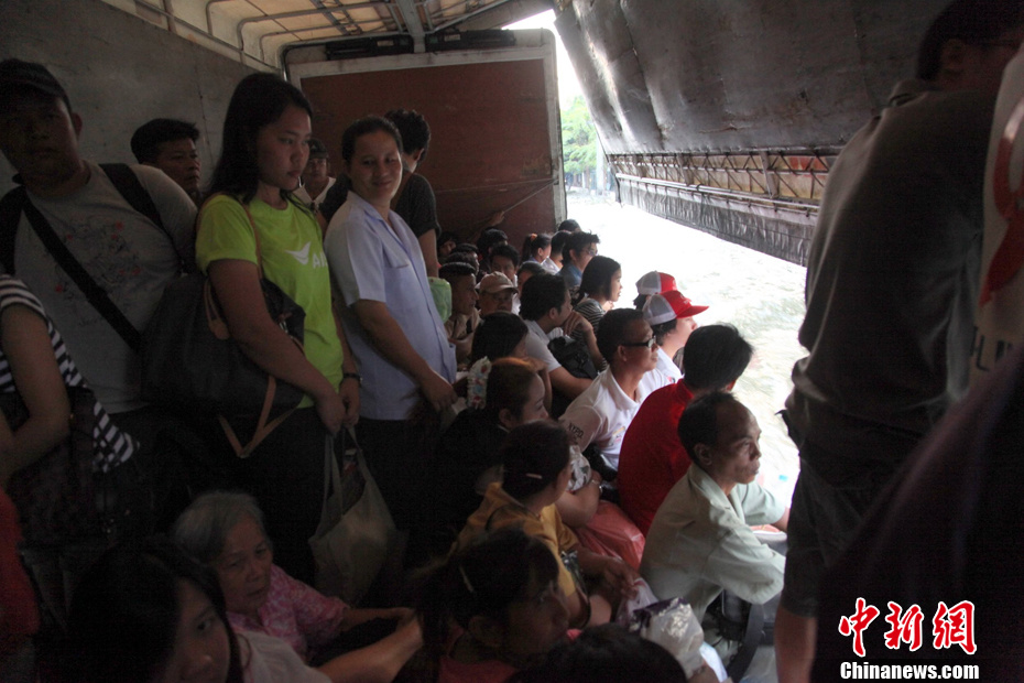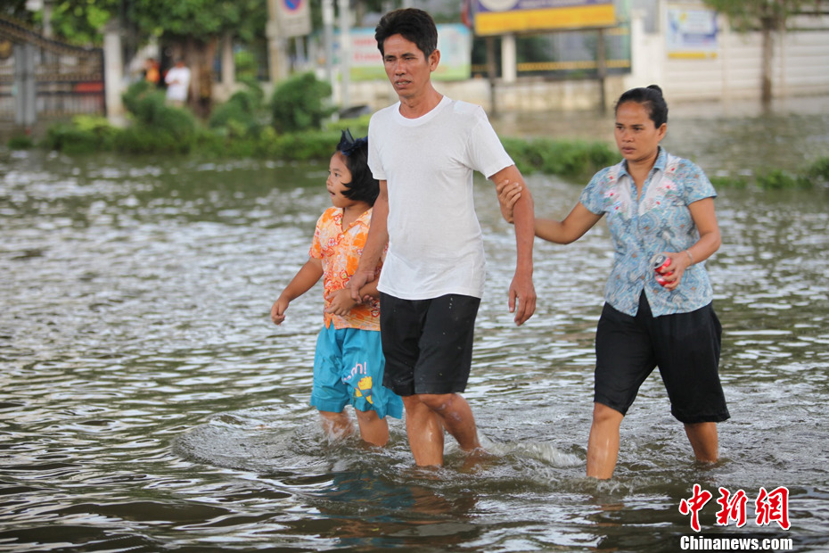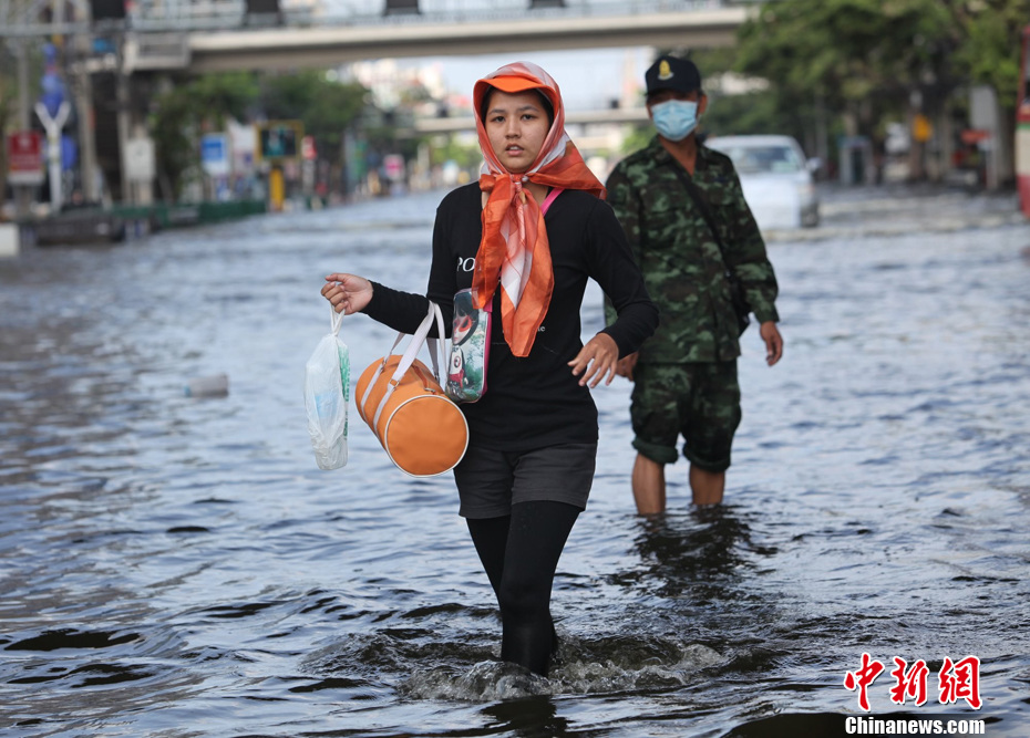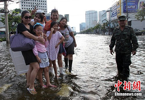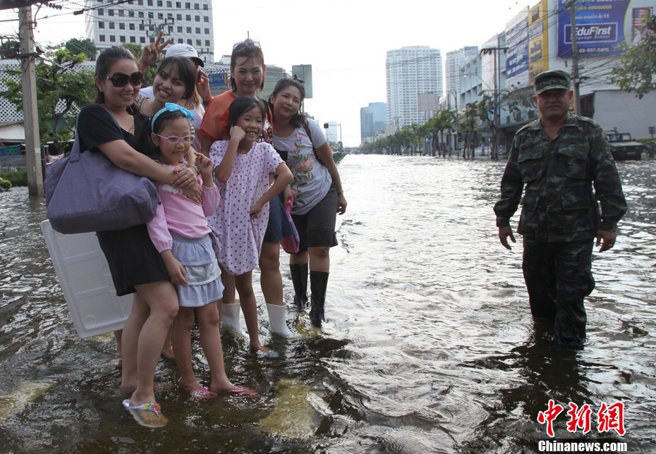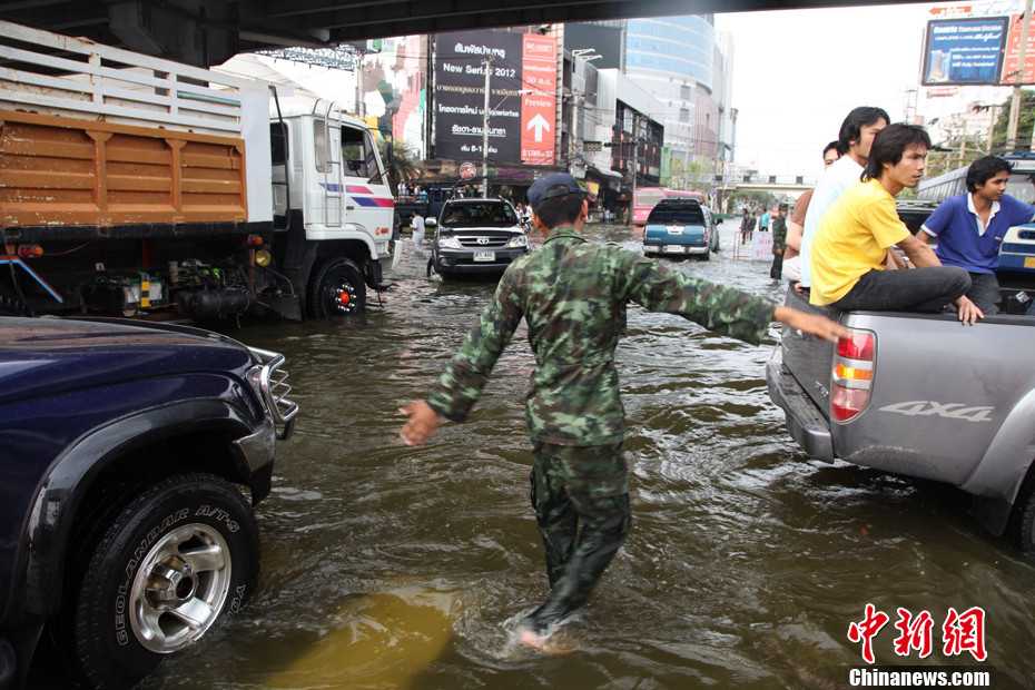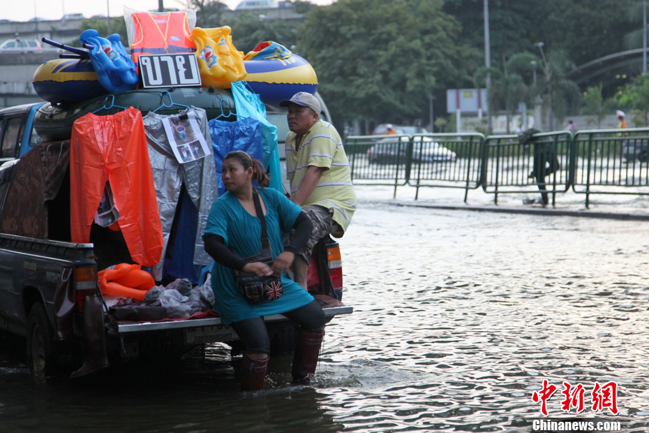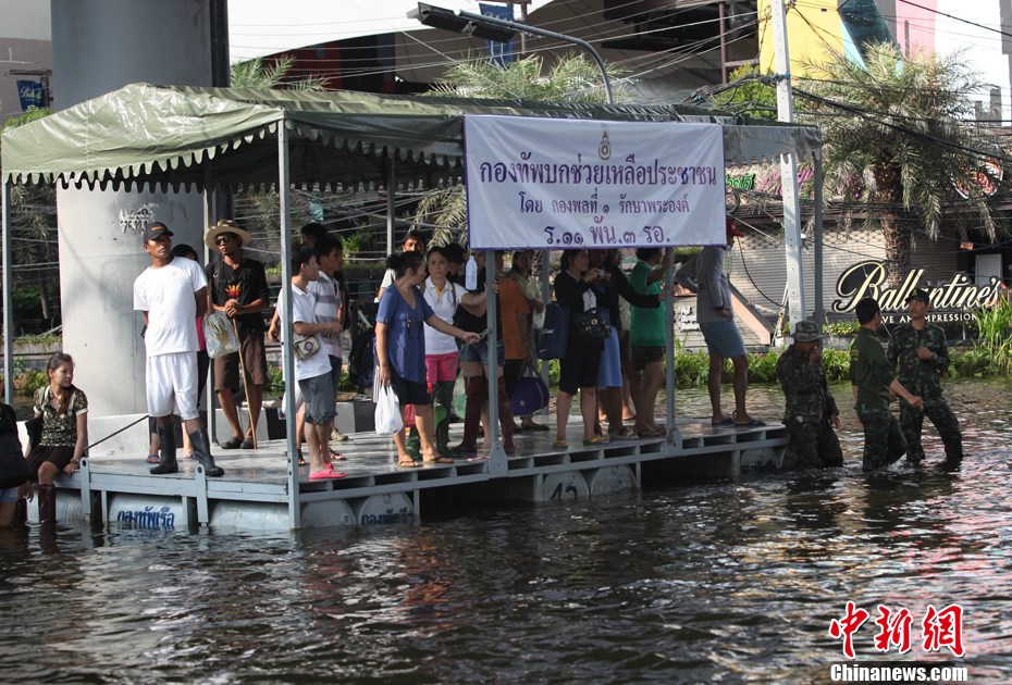 11月10日,洪水进入曼谷市区已逾一个星期,洪水当前,淡定的曼谷市民仍在洪水中坚持着自己的生意。中新社发 余显伦 摄