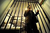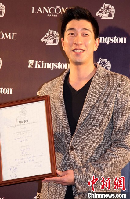 11月25日晚,第48届金马奖率先揭晓两个奖项,获11项提名的台湾影片《赛德克·巴莱》获评“观众票选最佳影片”。图为该片导演魏德圣向记者展示获奖奖座。中新社发 董会峰 摄
