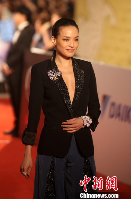 11月26日晚,台湾第48届金马奖颁奖典礼在新竹市举行,两岸三地知名女星身穿各色裙装走过红地毯,成为记者竞相拍照的焦点。图为大陆女星秦海璐和东京影展影帝王千源。两人入围本届金马奖最佳女主角、最佳男主角,但双双失利。董会峰 摄