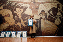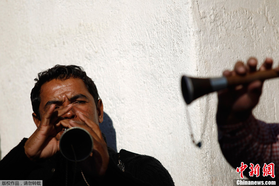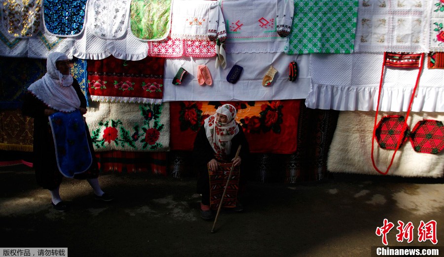 12月11日,在保加利亚西南部罗多彼山脉的里波诺夫村,一场传统婚礼正在进行。里波诺夫村以在冬季举行独特的传统婚礼闻名。依照习俗,除新郎家庭的女性成员外,新娘的面容不得为其他人所见,因此新娘的面部被厚实的白颜料和彩色金属片所遮盖,这也成为了婚礼的一大特色。图为为新娘化妆。