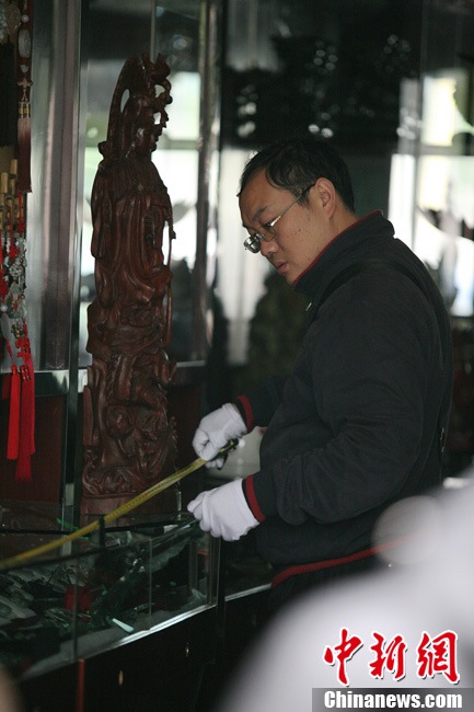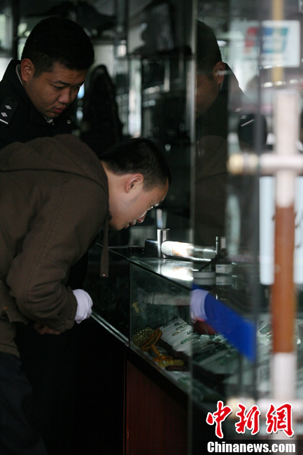 14日上午9点40分左右,位于长沙市繁华路段八一路的一家小型玉器珠宝店遭抢劫。目前劫犯在逃,店员未受伤。不愿透露姓名的店老板称,今日刚一开店门,就有一个20岁左右的男子拿着刀和锤子闯进店内,向一女店员扬言抢劫。随后该男子用锤子砸碎一柜台玻璃,抢走了几个玉镯子。据店老板介绍,被劫走的镯子价值约7、8万元。所幸的是女店员并未受伤。目前,长沙市公安局尚未对外透露具体案情,称正在调查之中。杨华峰 摄