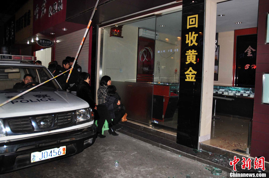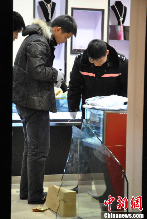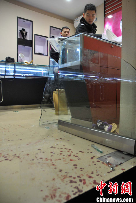 12月22日晚18时20分许,温岭市泽国镇泽南北路金仕乐珠宝店发生劫案。4名劫匪手持菜刀闯入金店内,在砸碎了店里的黄金玻璃橱后,抢走了一部分金银首饰,其中还有不少白金钻戒。店里仅有的两名服务员在反抗时,遭歹徒砍伤。其中一名男性店员头部被砍5刀受重伤,至当晚23时,其仍在台州一医院中抢救,未脱离生命危险。据警方透露,劫匪逃走时应该有接应,可能还不止4人。目前,温岭警方正在连夜全力侦查此案。中新社发 金云国 摄 CNSPHOTO
