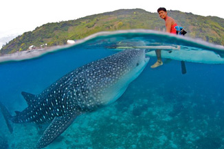 菲律宾渔民徒手喂鲸鲨