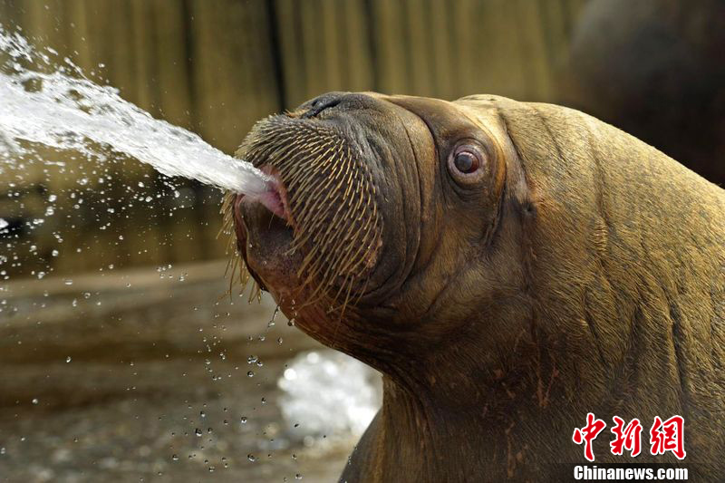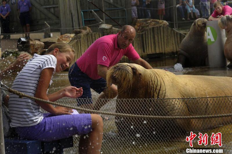 荷兰粗鲁海象水袭美女 口吐水珠让人瞠目