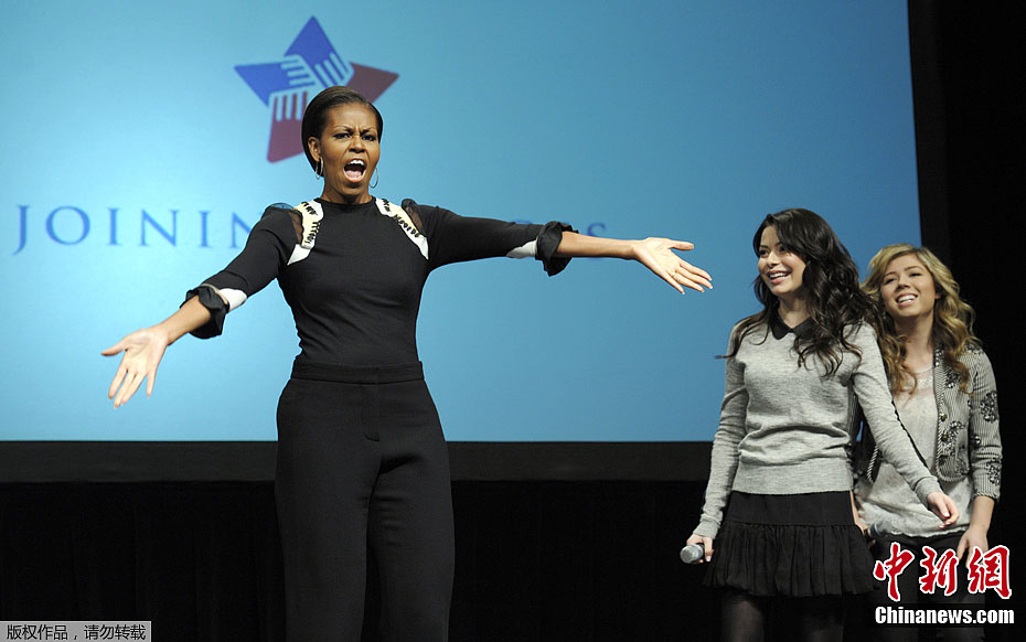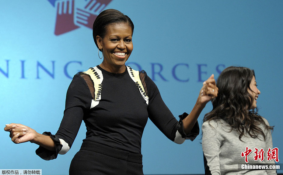1月13日,美国第一夫人米歇尔·奥巴马在美国弗吉尼亚黑费尔德中学,参与录制一个节目时同与会者一起跳舞展示“舞姿”。