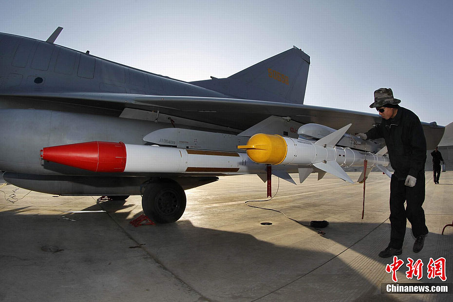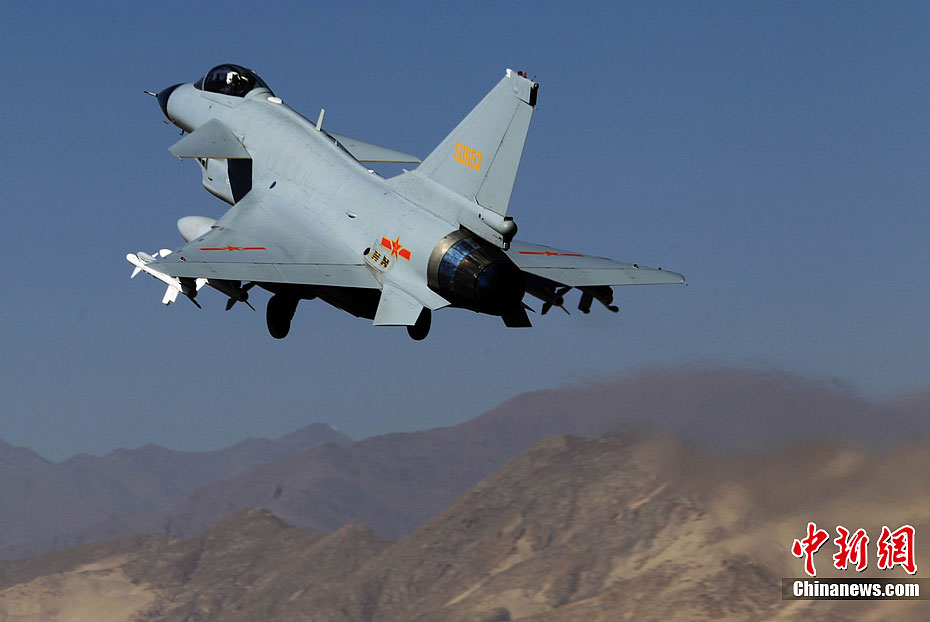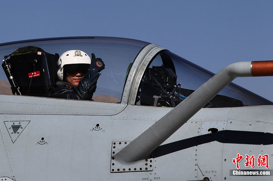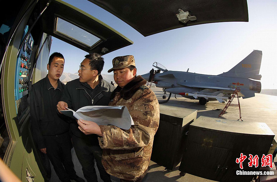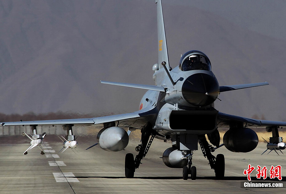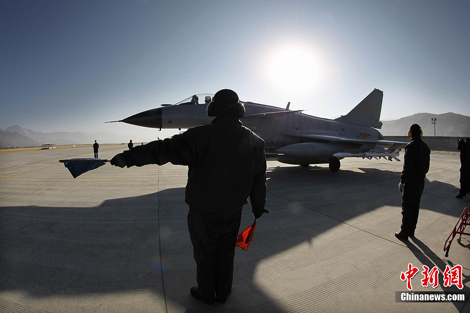 1月31日,雪域高原阳光明媚,万里无云。驻藏空军某军用机场战鹰列阵,车辆奔流,战士们在紧张有序中拉开龙年新春首飞的序幕。图为10时30分战鹰准时编队起飞。中新社发 刘应华 摄 图片来源:CNSPHOTO