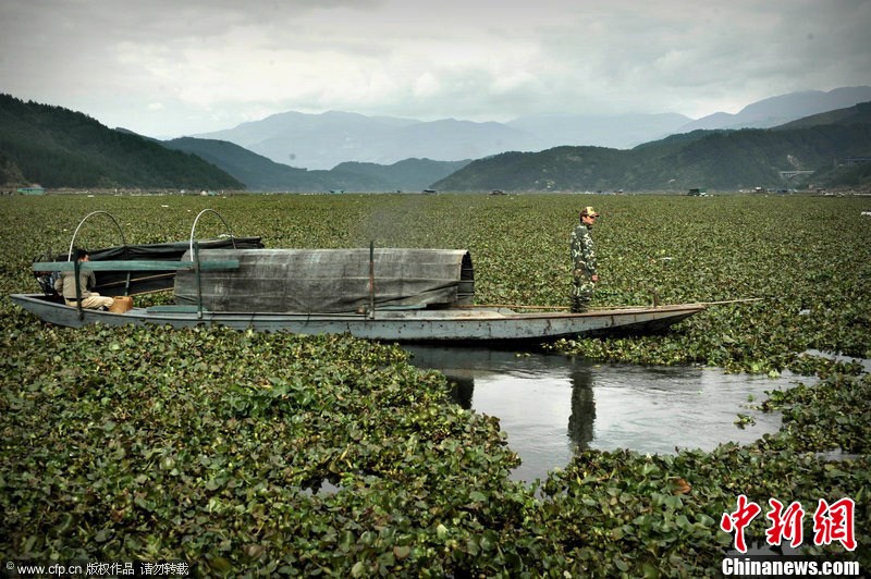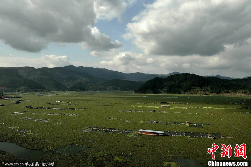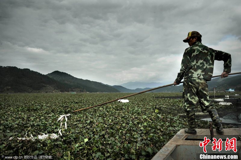 1月31日,福建宁德市古田县水口镇湾口村段,浩浩荡荡的水葫芦延绵闽江近10公里,如同草原。2011年,该镇400多养殖户的网箱遭遇大面积死亡现象损失上亿元,今年养殖区又遭水葫芦围困鱼苗都无法放养。柳涛 摄 图片来源:CFP视觉中国