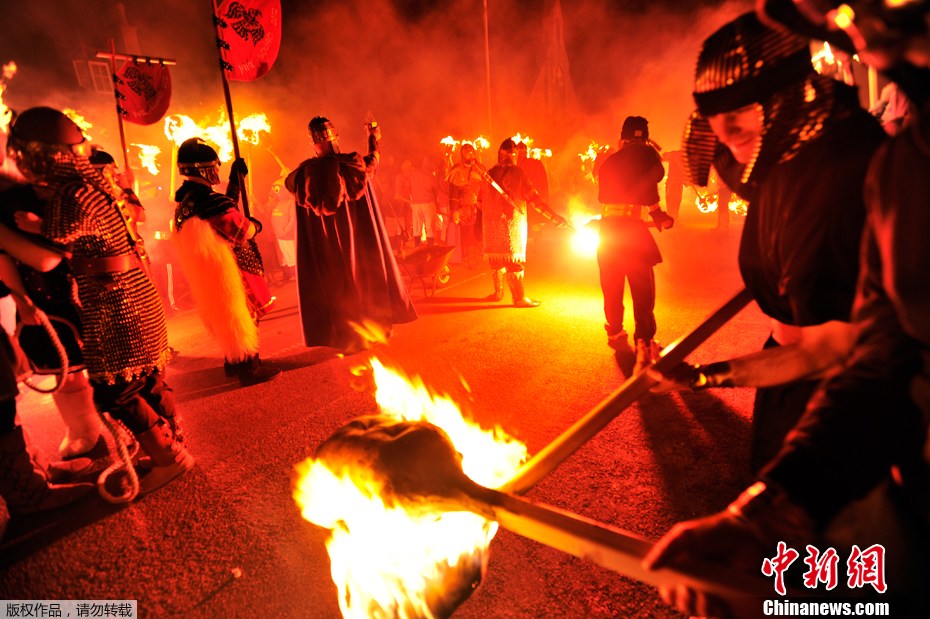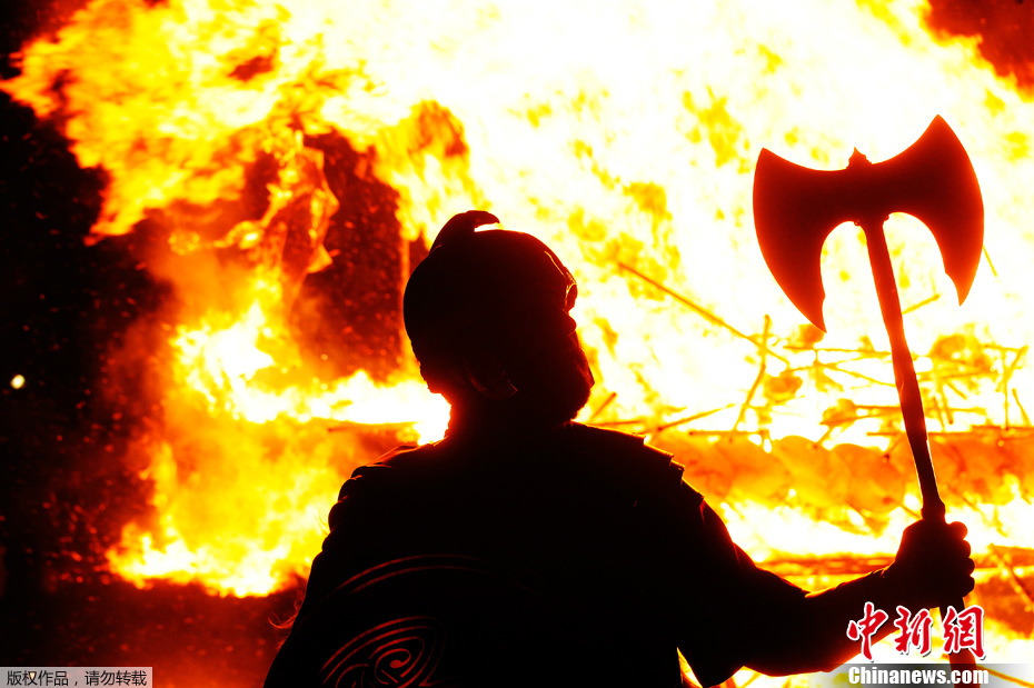 1月31日,在英国北部设得兰群岛的勒威克,人们装扮成海盗参加火祭(Up Helly Aa)。一年一度的火祭是设得兰群岛最盛大的节日,每年1月的最后一个星期二举行,节日的高潮是焚烧一条海盗船。