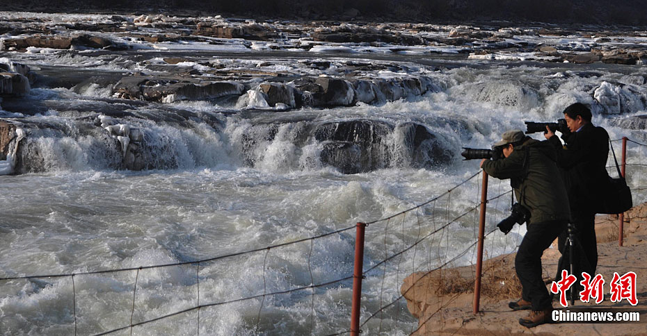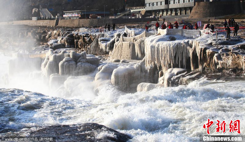 近日,黄河壶口瀑布出现“冰桥”景观。由于连日来的急剧降温,地跨晋陕两省的黄河壶口瀑布因上游冰凌的不断涌入堆积,形成“冰桥”奇观,往日里“万马奔腾”的瀑布呈现出别样风情。中新社发 饶北成 摄 图片来源:CNSPHOTO