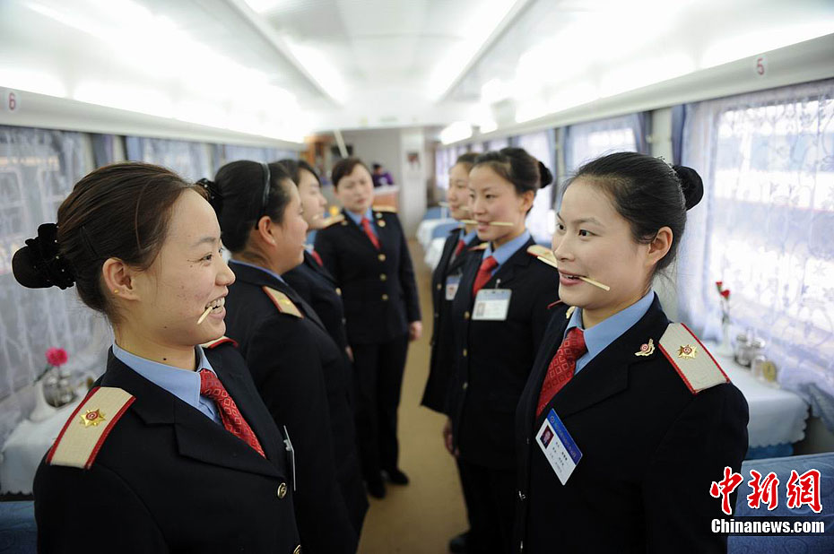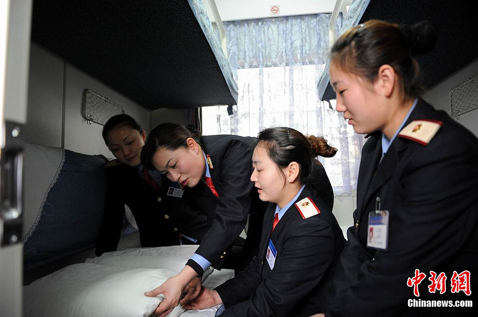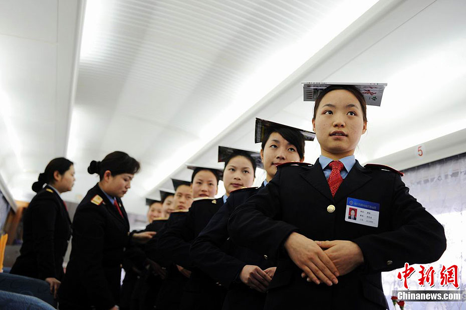 2月10日是2012年春运第34天,在南昌至昆明1235次列车上,90后女乘务员们利用休息时间,忙着练习服务礼仪。休息不忘“充电”,成为列车乘务员们最好的活动方式之一。图为当兵出身的车长蔡俊在列车员的头上放上书本。熊艳 摄
