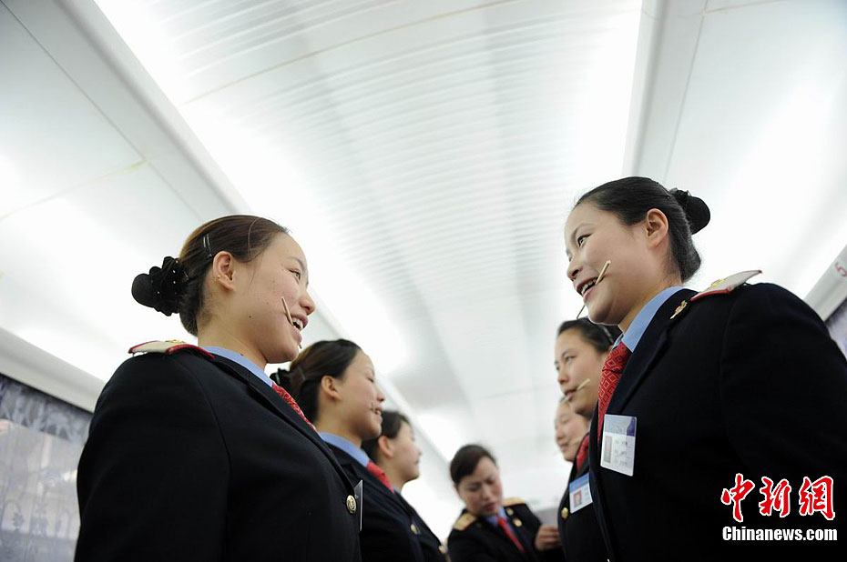 “90后”女乘务员练习服务礼仪