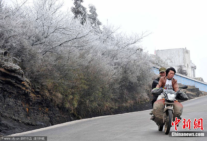 在贵阳市花溪区高坡乡与黔南州龙里县草原乡一带山上,因气温变化多端,出现三九天的雾凇景观。据草原乡村民介绍,8日山上春光明媚,9日凌晨以后气温突然下降,立春以后还这样严重寒冷结冰的现象,过去十分少见。据贵州气象部门预报,未来几天,贵阳仍有冻雨。图为2月10日,车辆行驶在贵阳市花溪区高坡乡公路上,旁边冰凌成片。龚小勇 摄 图片来源:CFP视觉中国