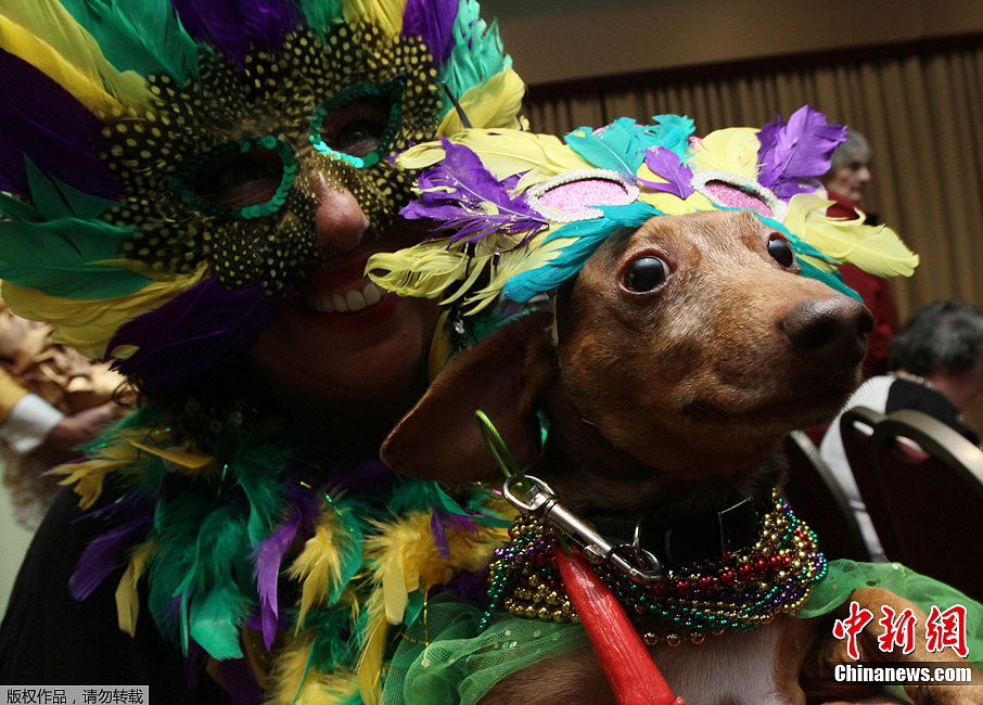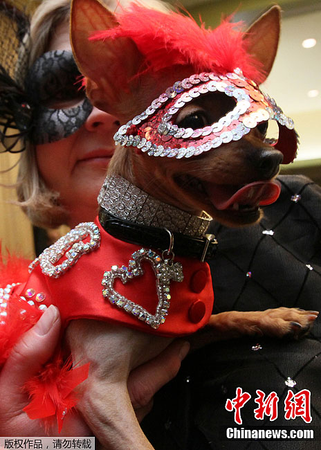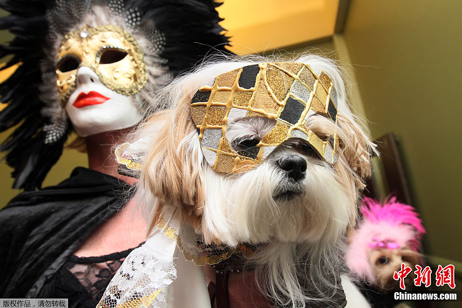 美国历史最悠久、规模最大的威斯敏斯特狗展将于2月13日和14日在纽约麦迪孙广场花园举行。图为2月10日,小狗被主人装扮一新准备参赛。