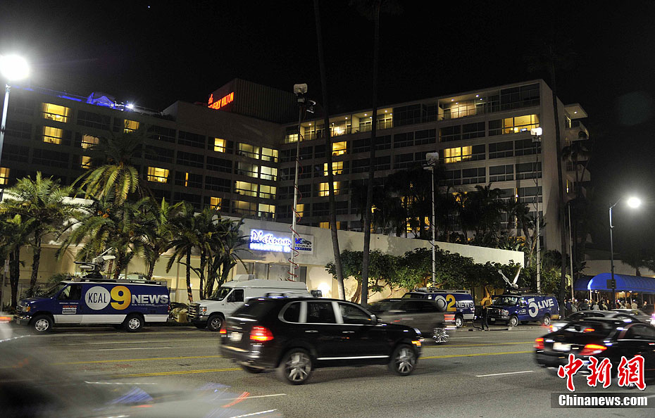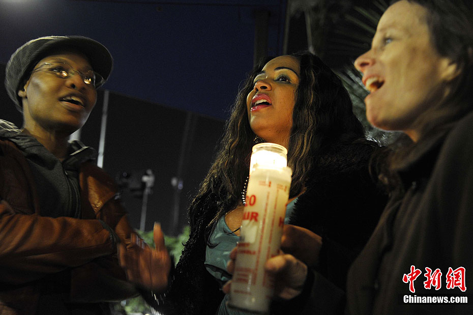 美国天后级流行歌星惠特尼·休斯顿当地时间2月11日在洛杉矶比佛利山希尔顿酒店突然去世,享年48岁。其死亡原因尚未公布。图为歌迷在希尔顿酒店前唱惠特尼生前演唱的歌曲悼念她。中新社记者 毛建军 摄