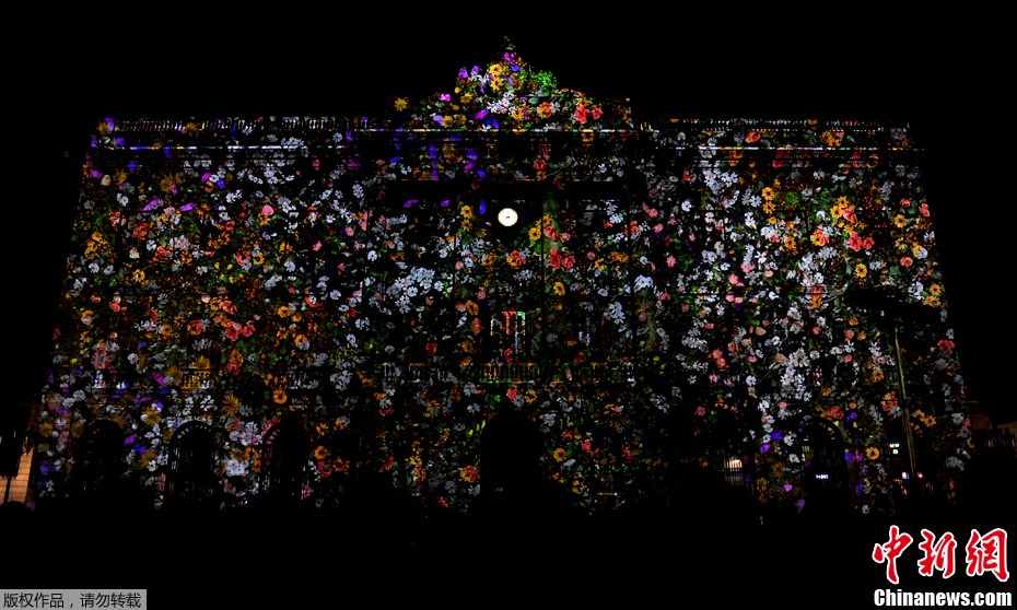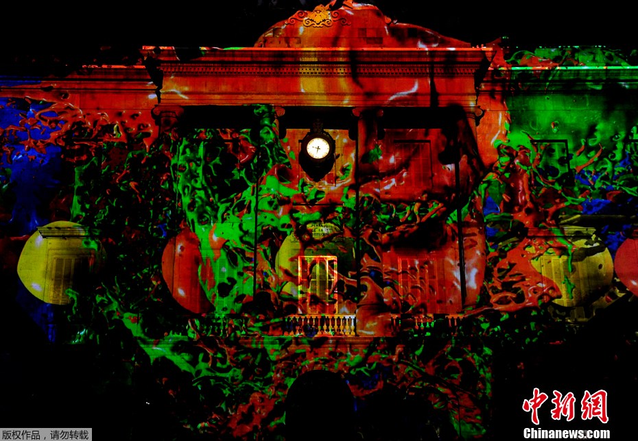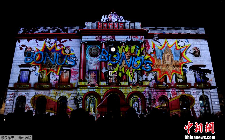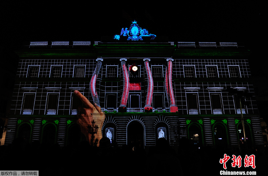 2012年2月12日,西班牙巴塞罗那的城市市政大楼举行冬季灯光秀,梦幻的灯光照在市政大楼上,吸引了众人前来观赏。