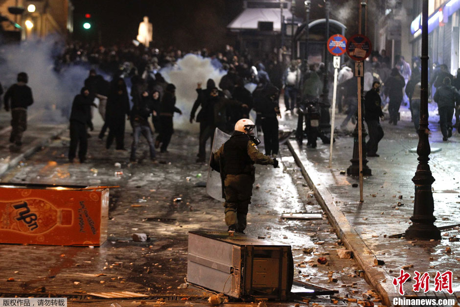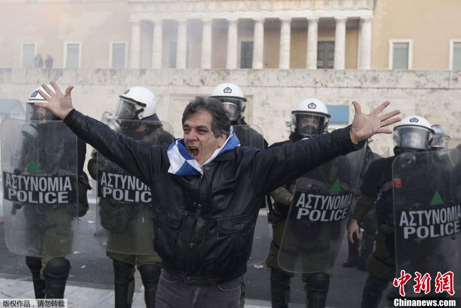 当地时间2月12日,希腊议会通过总额为33亿欧元的新紧缩措施。希腊警察和示威者在首都雅典的街头爆发了冲突。图为示威者向警察投掷石块。