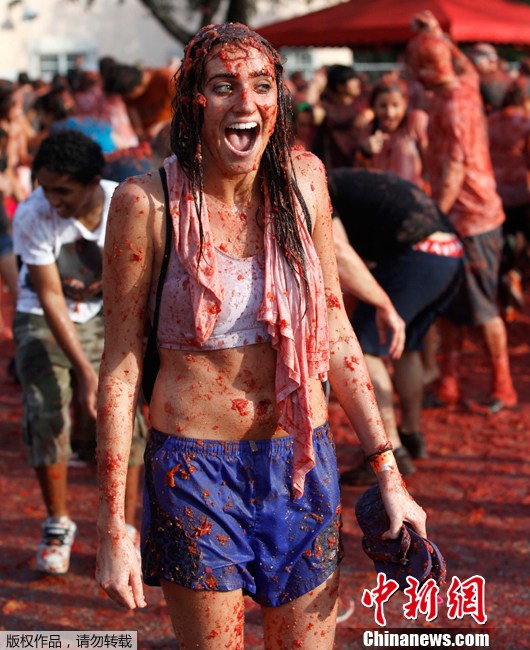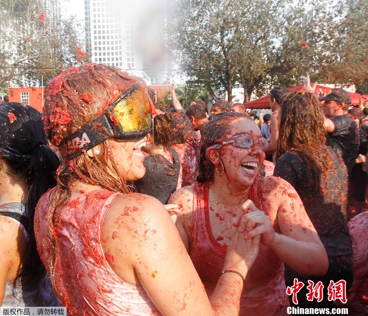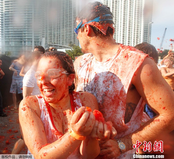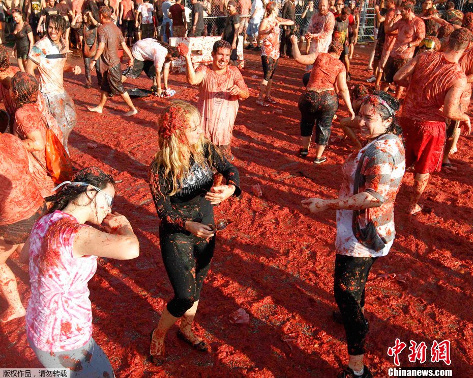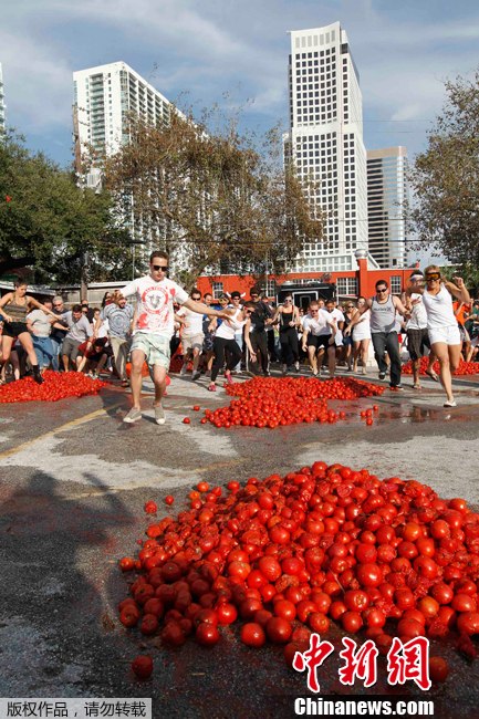 2012年2月11日,美国迈阿密上演番茄大战,参赛者尽情狂欢,共消耗25000个西红柿。
