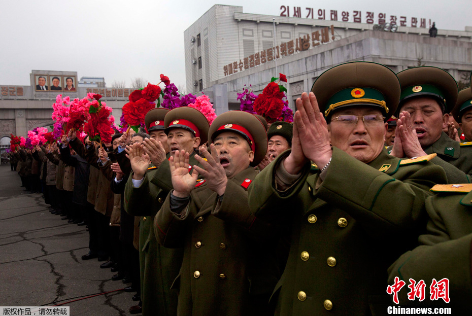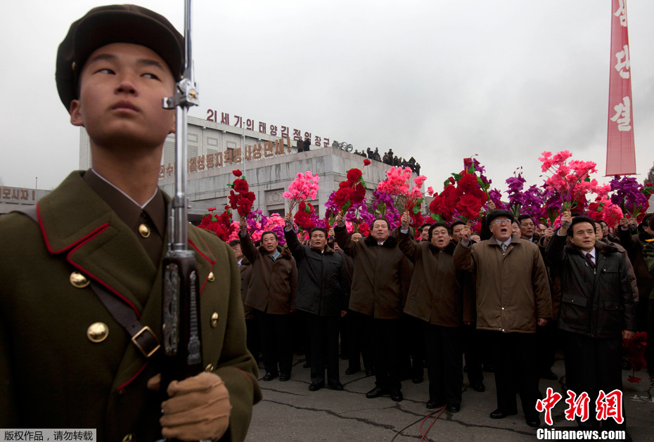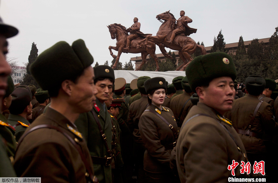在纪念朝鲜已故最高领导人金正日诞辰70周年之际,朝鲜2月14日在平壤万寿台创作社举行已故国家主席金日成和金正日铜像揭幕仪式。