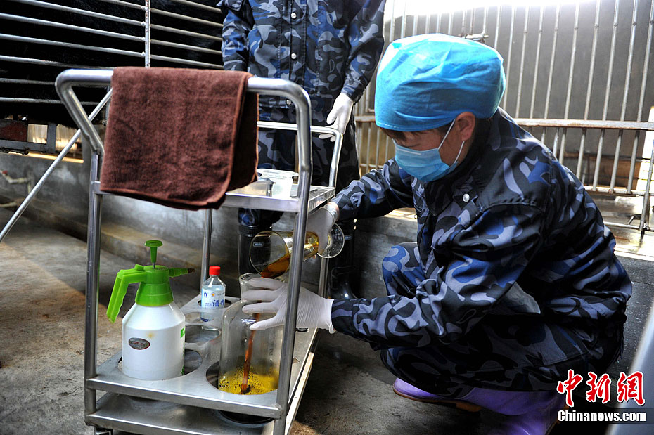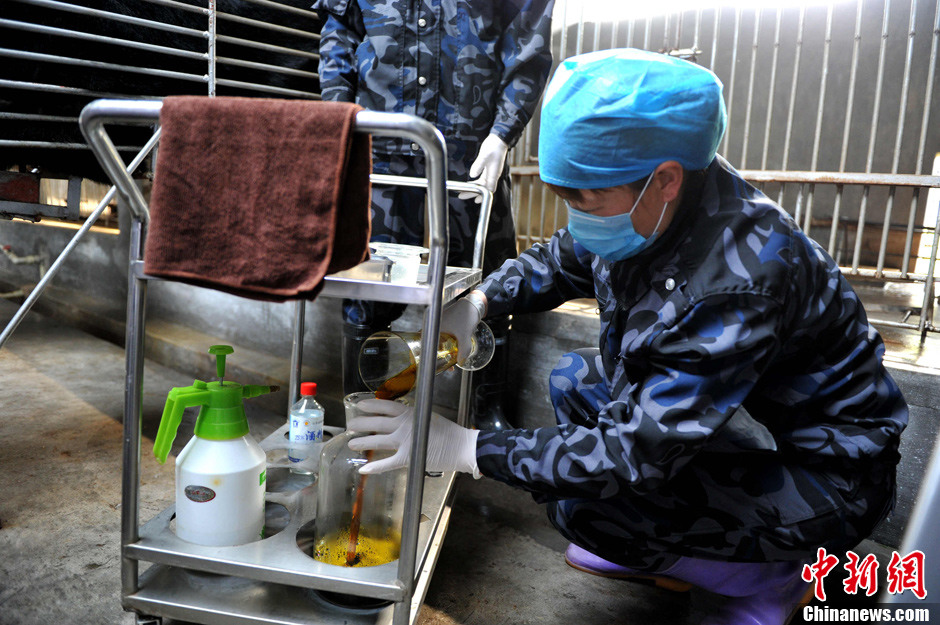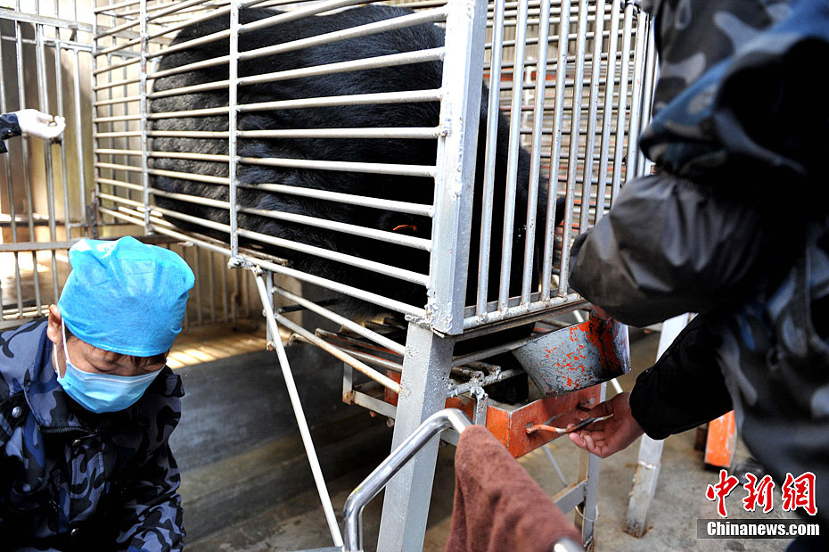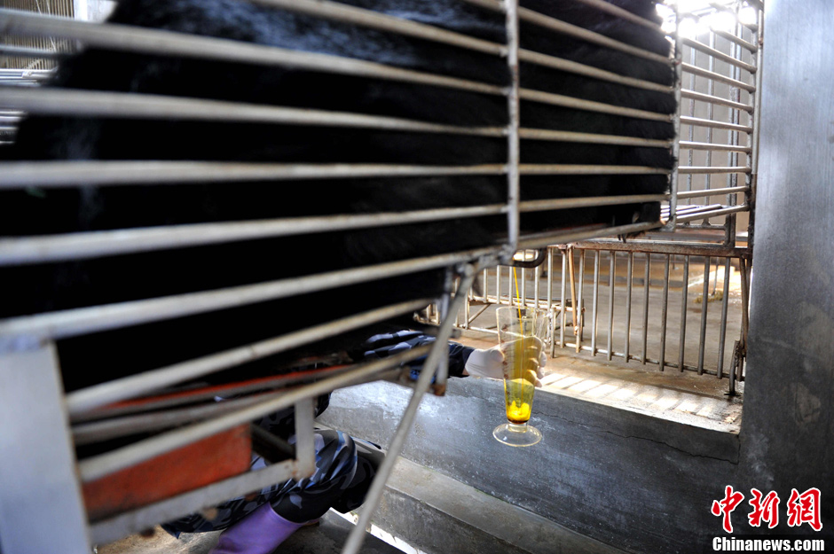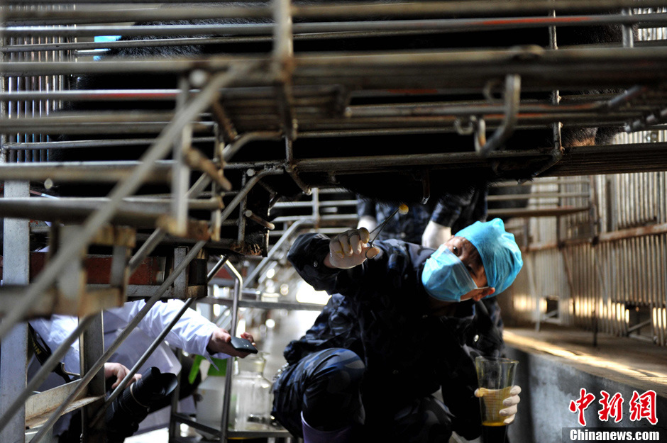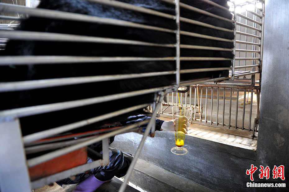 2月22日,归真堂“黑熊养殖基地”对外开放,这个备受关注的“开放日”吸引了来自海内外百余名媒体记者。图为“活熊取胆”过程,胆汁顺着引流管出来。王东明 摄