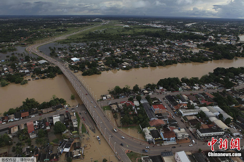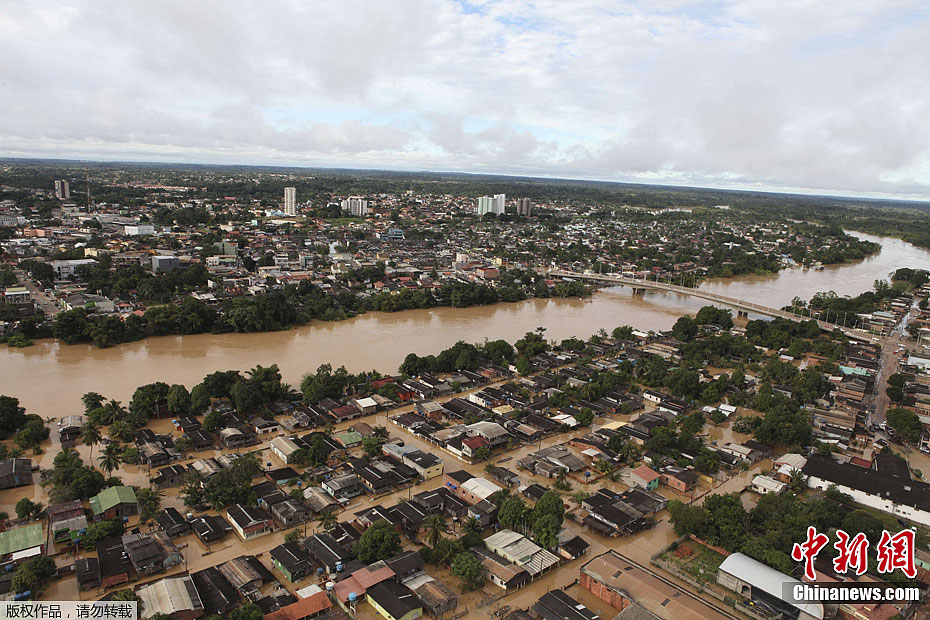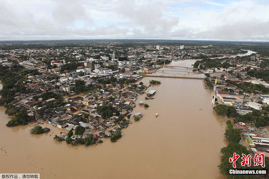 由于受到强降雨的影响,作为巴西与玻利维亚和秘鲁的国界界河的阿克里河洪水泛滥,迫使16798人离开家园寻找避难所。图为2月23日航拍的阿克里河洪灾情况。
