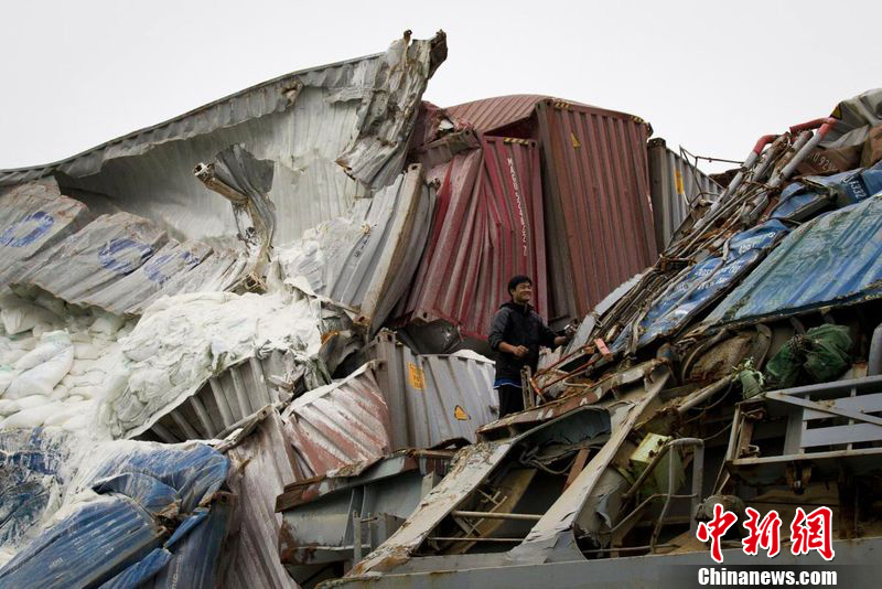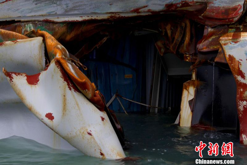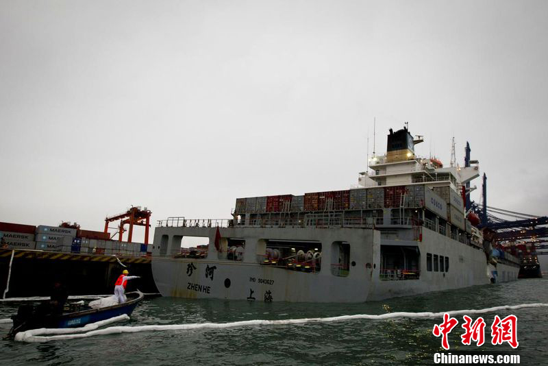2012年2月25日下午,在深圳外海两艘大型集装箱船发生碰撞事故,其中一艘船身出现裂口,船上集装箱挤压严重变形,事故未造成油污泄漏和人员伤亡。图为工作人员正在货轮周围铺上防油垫。图片来源:东方IC 版权作品 请勿转载