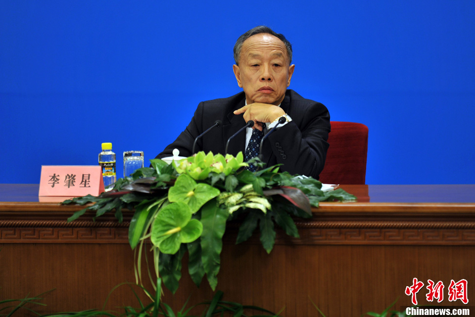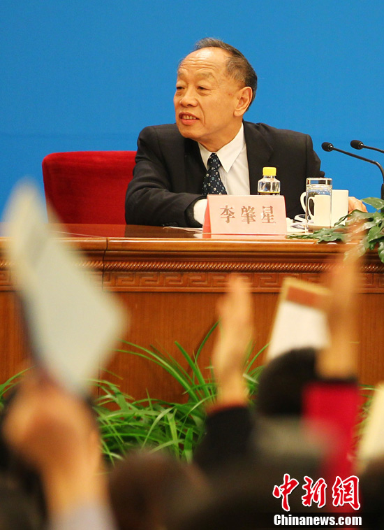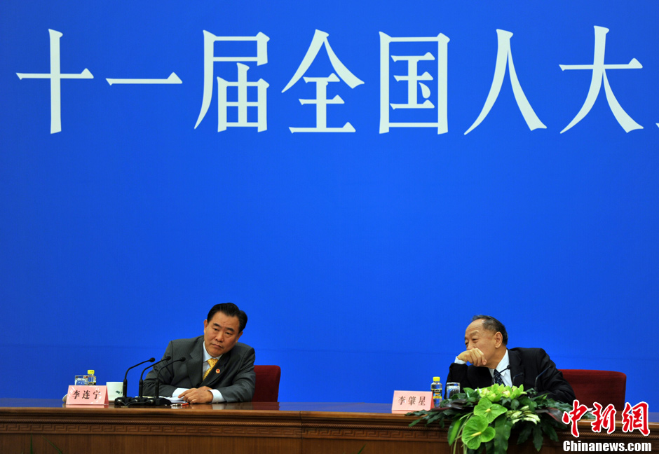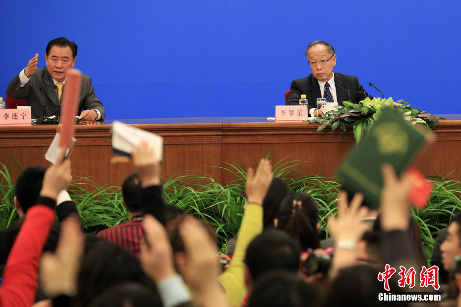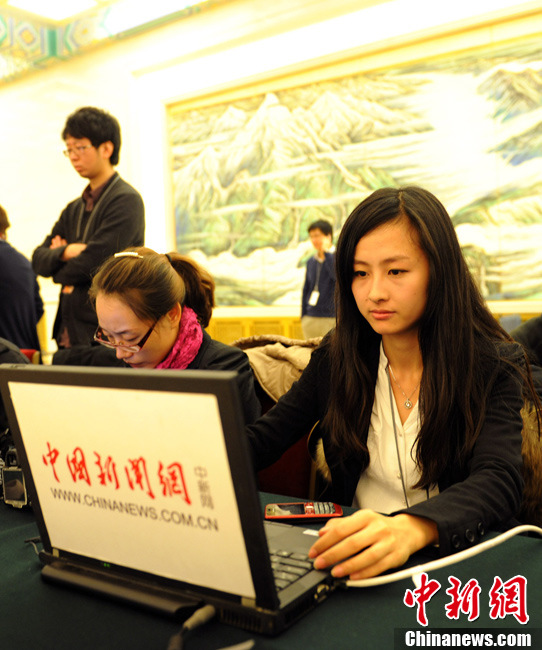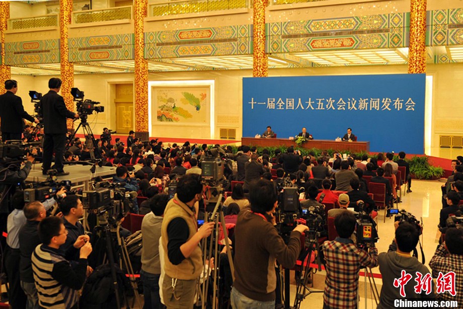 3月4日上午,十一届全国人大五次会议在人民大会堂三楼金色大厅举行新闻发布会,由大会发言人李肇星就会议议程和人大工作相关的问题回答中外记者的提问。图为中新网记者现场报道。中新网记者 金硕 摄