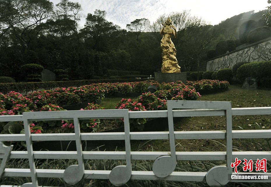 阳春三月的台北市东北部远郊,“何日君再来”的歌声吟唱于金宝山墓园“爱区”的邓丽君纪念公园。乐坛造型的花丛绿荫中一隅,为一代歌皇巨星邓丽君墓地。中新社记者 贾国荣 摄