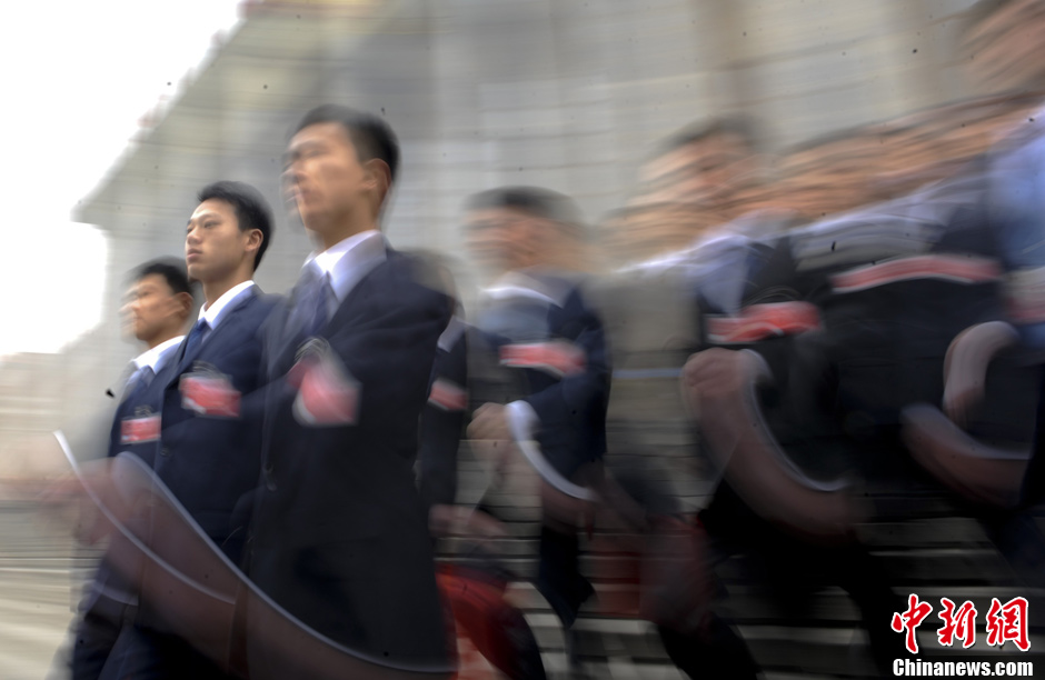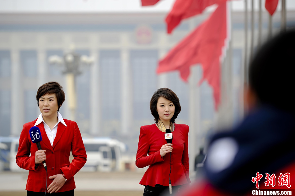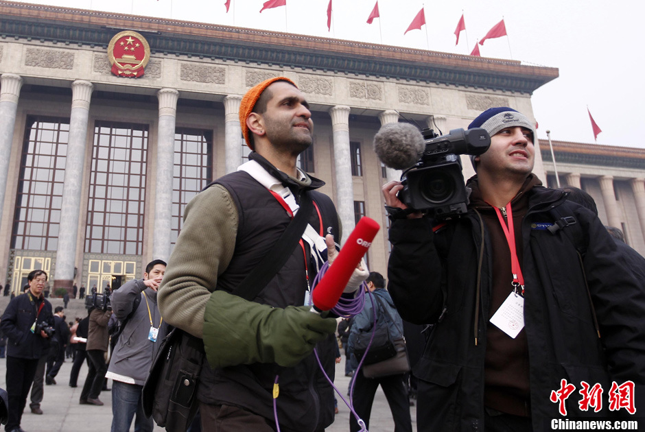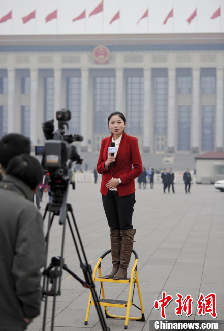 3月5日,北京人民大会堂外一名外国记者架起一台摄像机,自己对着空空的摄像机神情庄重报道中国两会,摄像、主持一肩挑。当日,十一届全国人大五次会议在北京人民大会堂开幕。中新社记者 王中举 摄