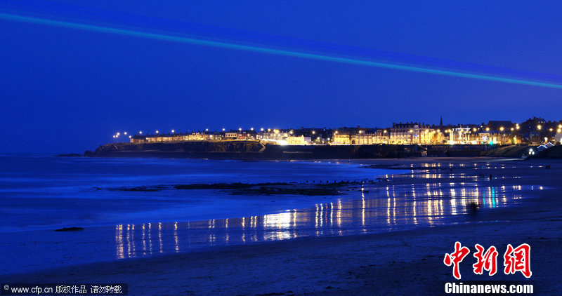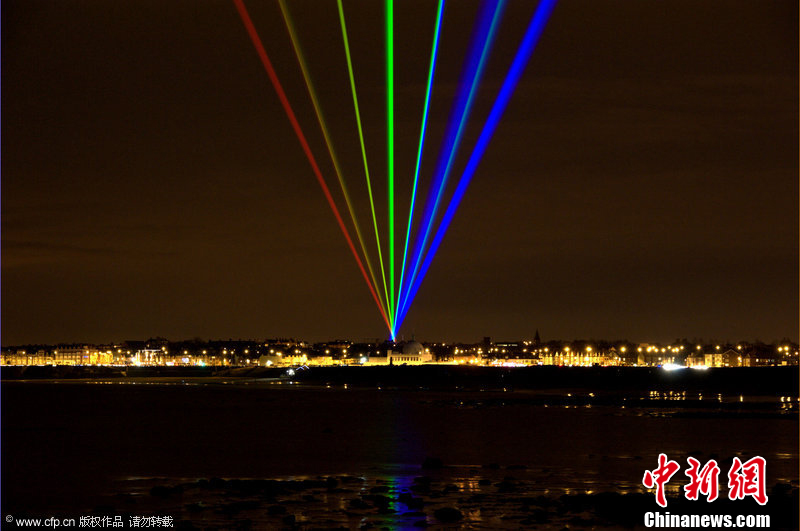 2012年3月4日,英国惠特利贝湾上空横穿七柱彩色激光,形成巨大的“人造彩虹”,蔚为壮观。这是东北地区2012文化奥运系列活动的第一台重头戏,由美国艺术家伊维特·麦滕斯(Yvette Matterns)创作,名为“环球彩虹(Global Rainbow)”。连续展示五个晚上的“环球彩虹”,是庆祝伦敦奥运的开场文化活动,吸引了大批民众参与并欣赏。苟秉宸 摄 图片来源:CFP视觉中国