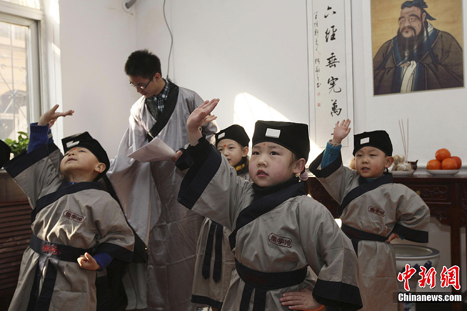 春日时节,在山西太原,十余名学龄前儿童身着汉服行拜孔礼,领略国学,感受中华传统文化的精髓,从小培养良好的行为习惯和道德品质。中新社发 韦亮 摄