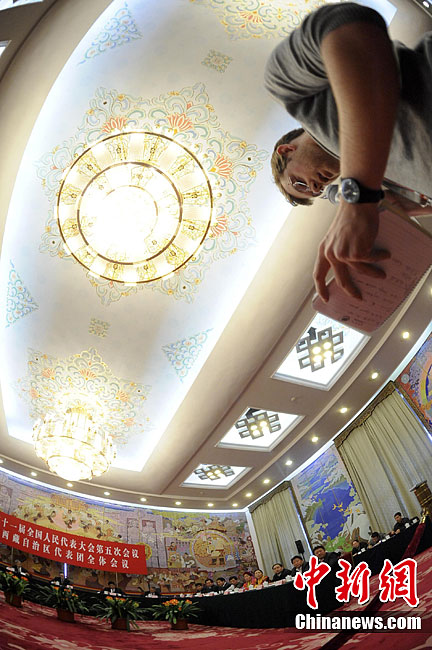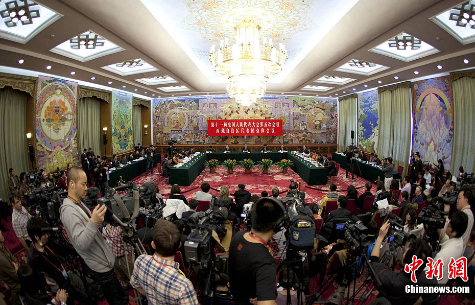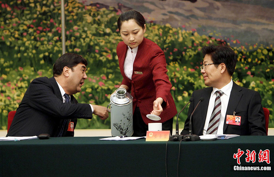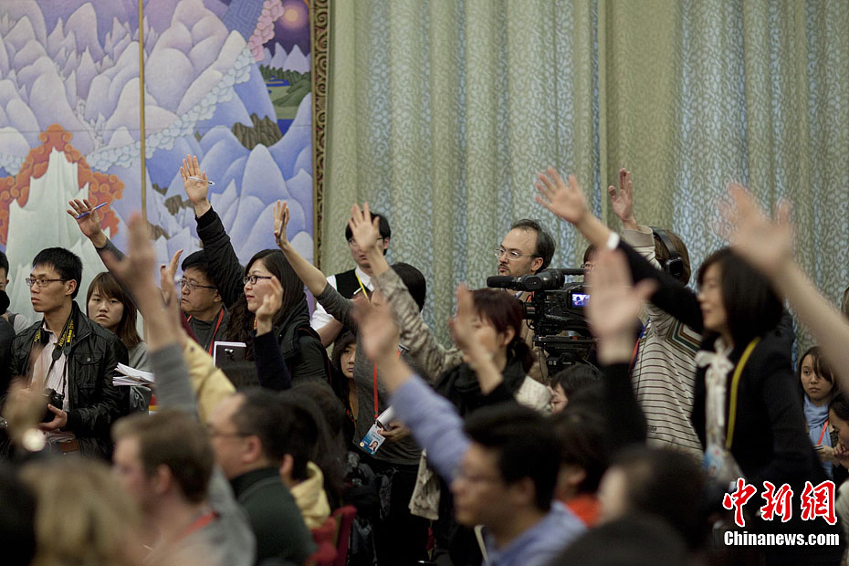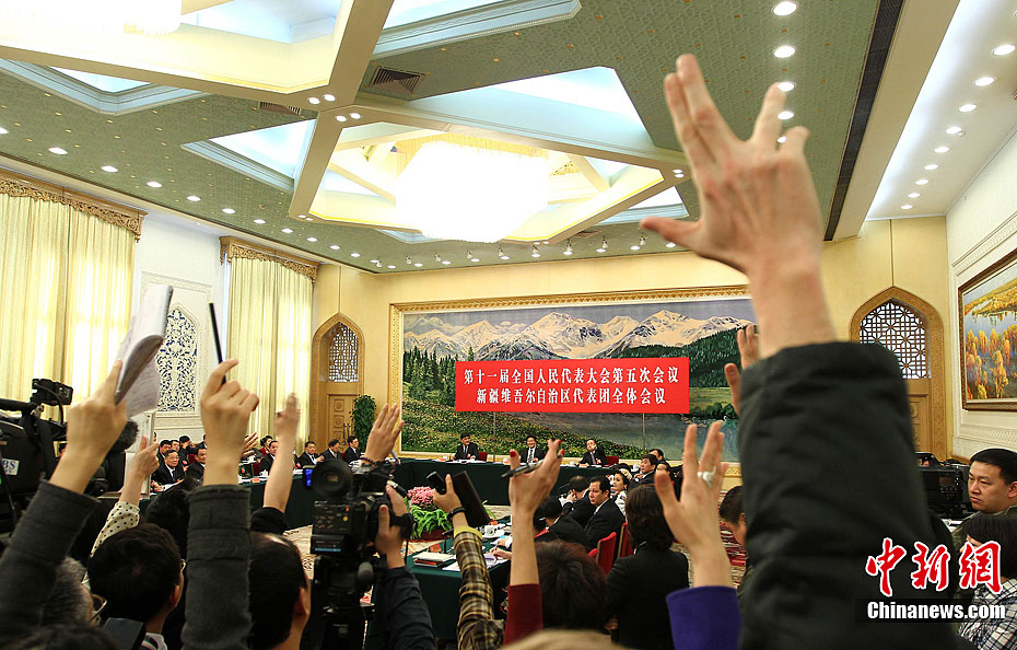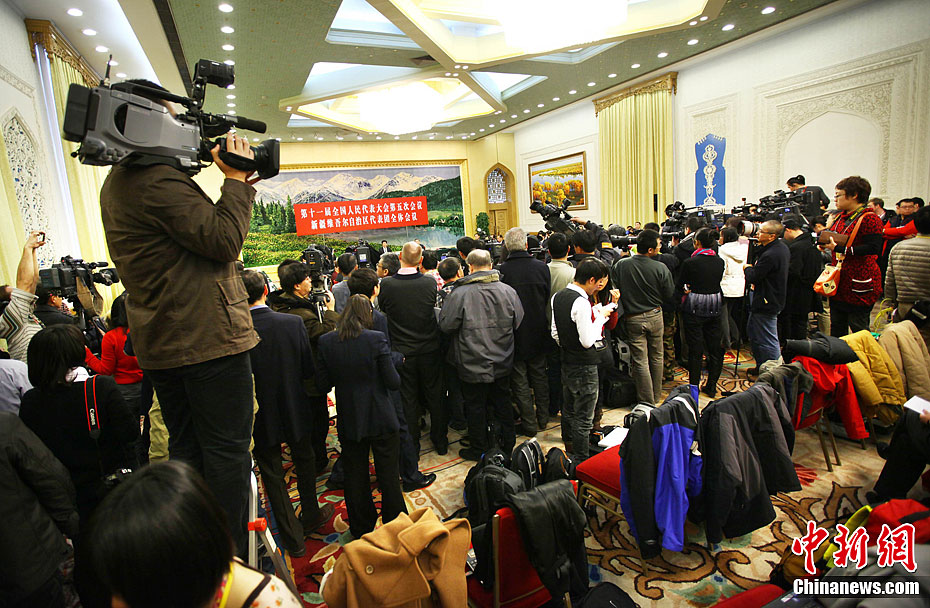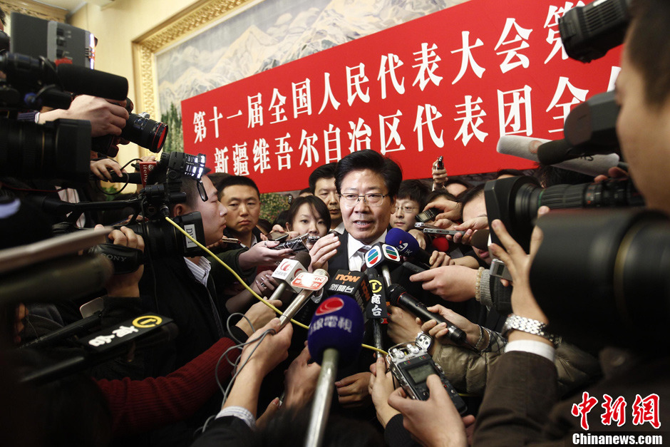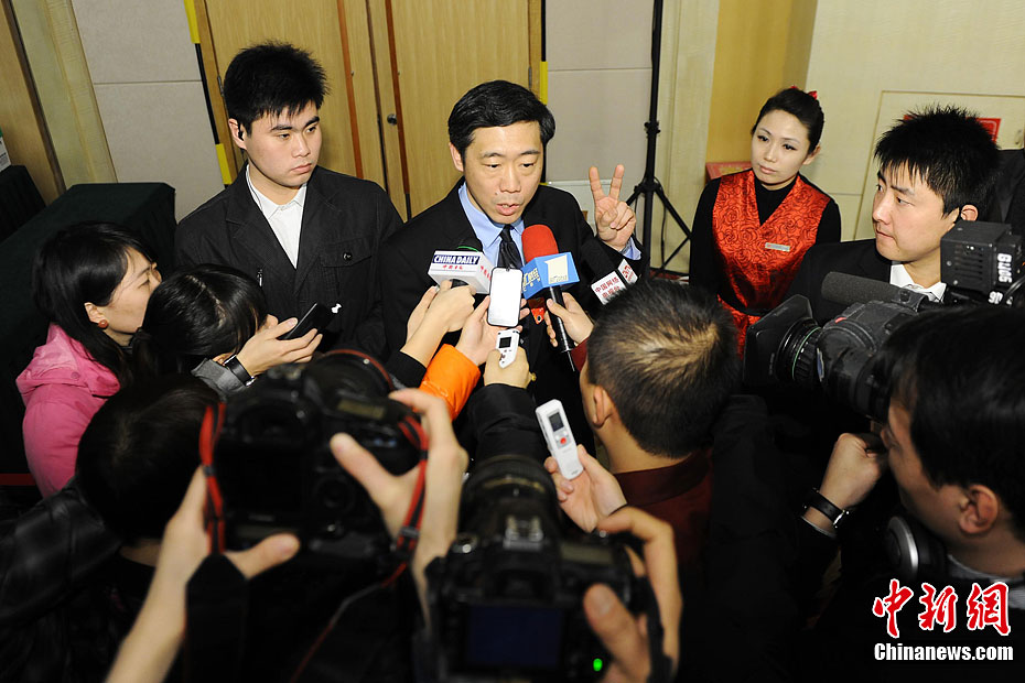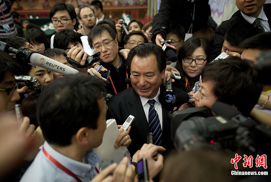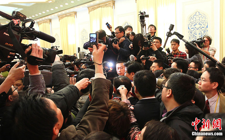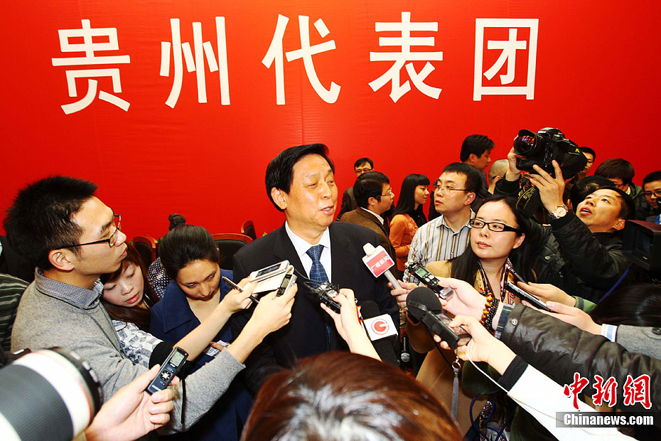 3月7日上午,十一届全国人大五次会议贵州代表团向媒体开放,吸引80余家近180名记者到场采访。会后,全国人大代表、贵州省长赵克志被记者包围。中新社发 张伟 摄