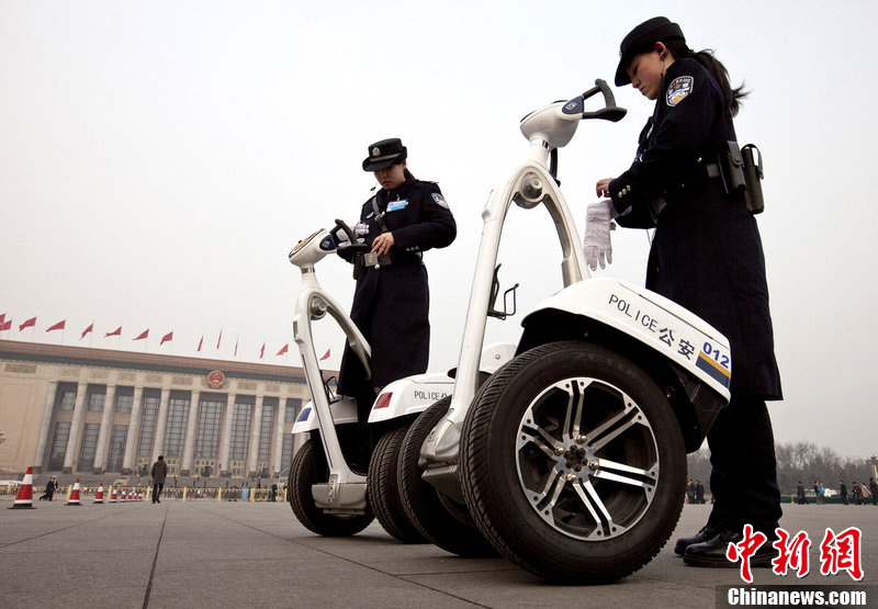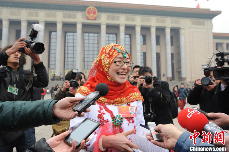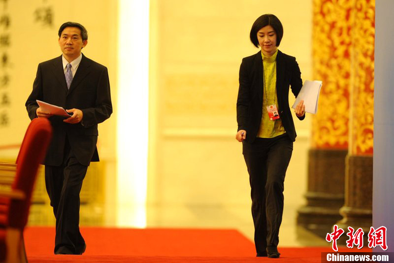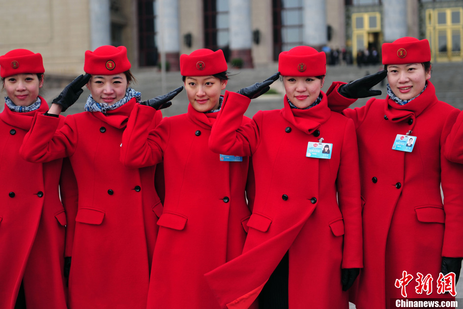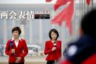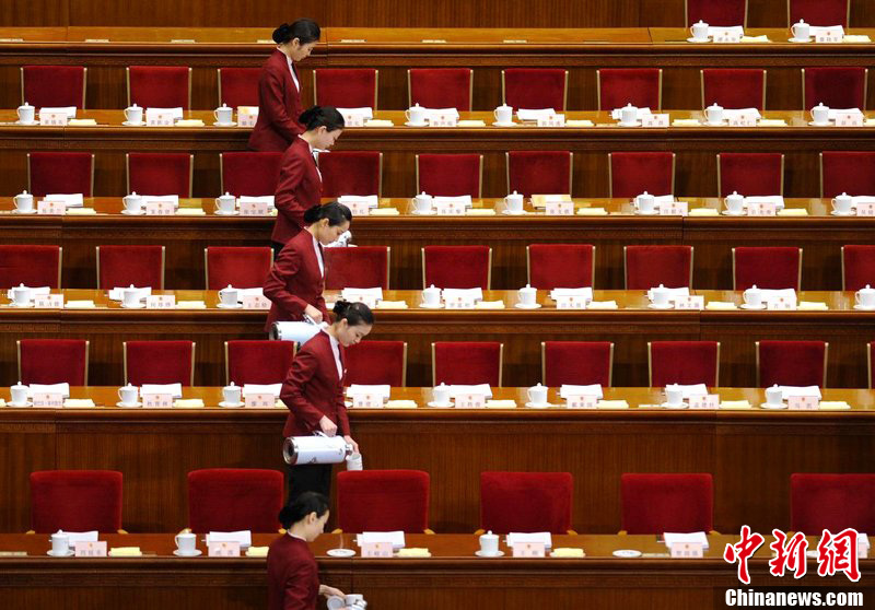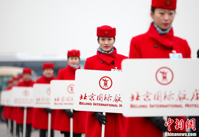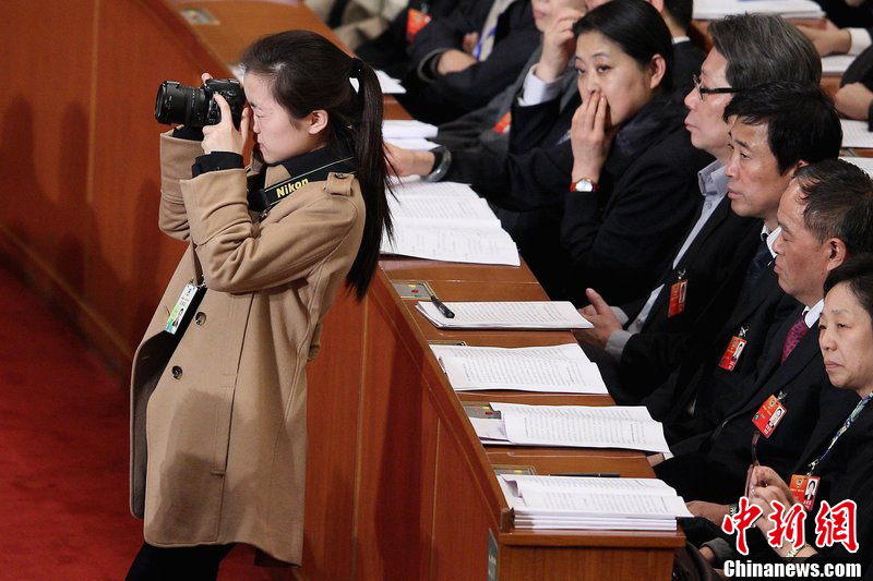 3月3日下午3时,全国政协十一届五次会议在北京人民大会堂开幕。会议开幕前,央视女主持人在天安门广场做现场报道,助理为其举起反光板补光。中新社记者 李学仕 摄