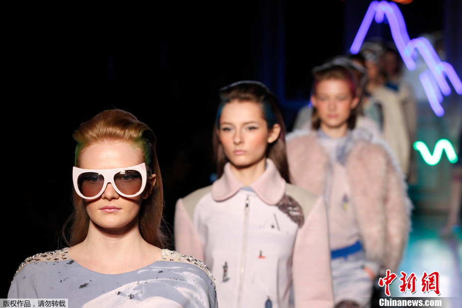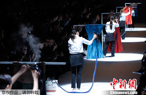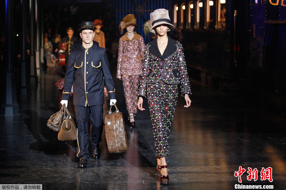 2012年3月7日,2012巴黎时装周上,模特们展示路易威登品牌时装。