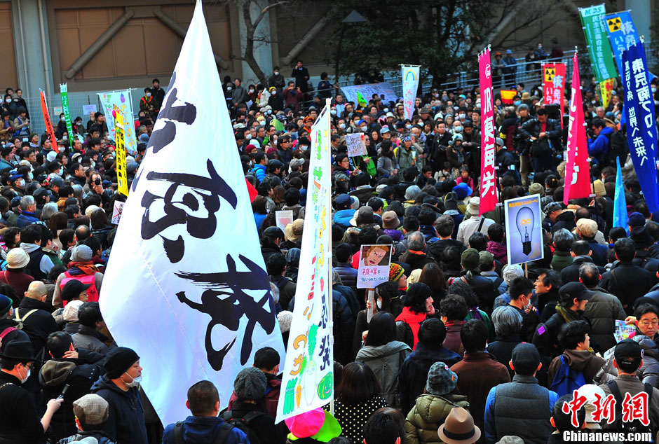 3月11日,东京市中心的日比谷公园成为反核人士集会的大本营,7000余名市民高呼“废炉刻不容缓”、“我们不要核能”等口号,将日本国会团团围住。他们通过“人锁”来表达自身对于核的愤怒。中新社发 孙冉 摄
